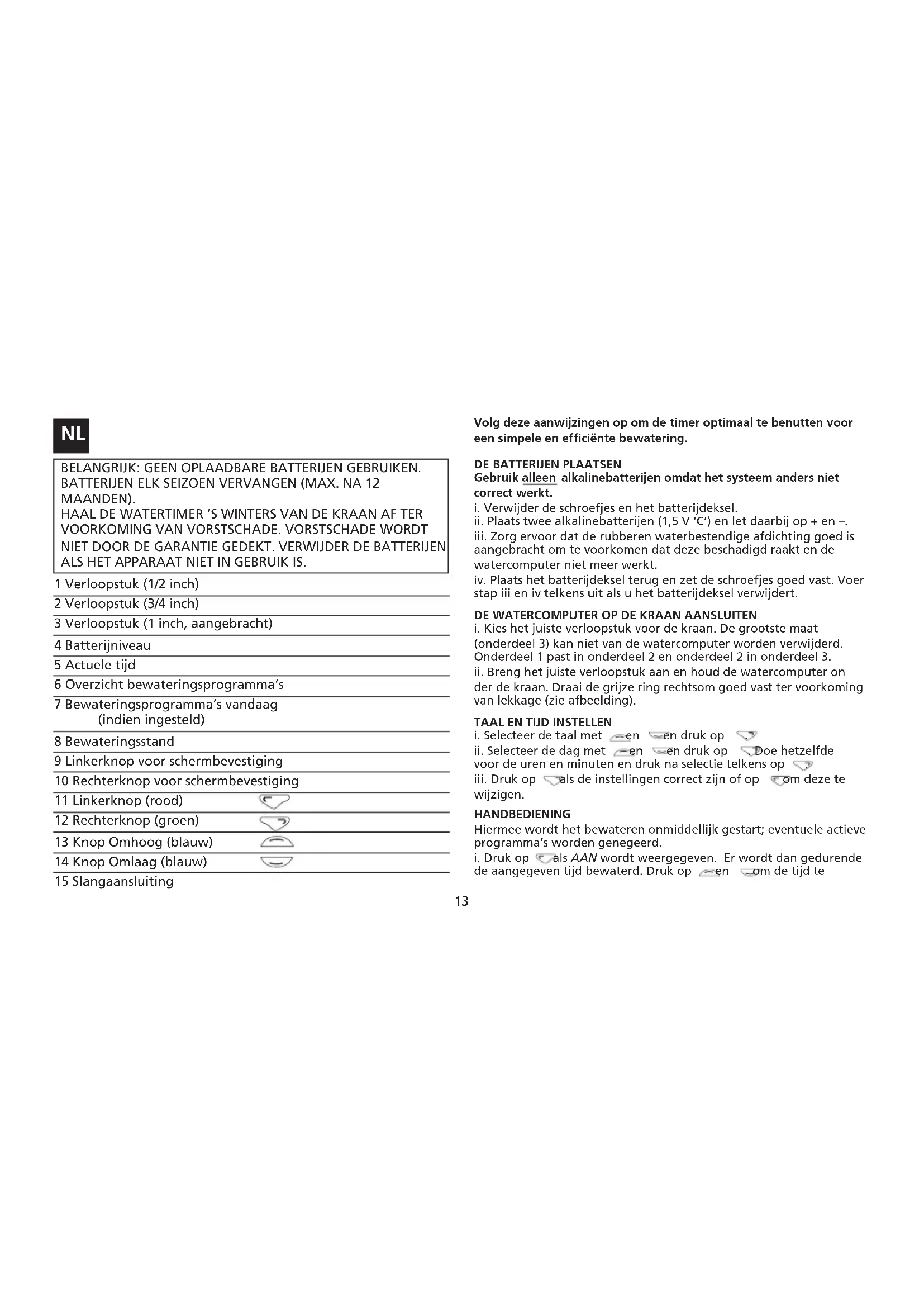 1 Verloopstuk (1/2 inch) 2 Verloopstuk (3/4 inch) 3 Verloopstuk (1 inch, aangebracht) 4 Batterijniveau 5 Actuele tijd 6 Overzicht bewateringsprogramma’s 7 Bewateringsprogramma’s vandaag (indien ingesteld) 8 Bewateringsstand 9 Linkerknop voor schermbevestiging 10 Rechterknop voor schermbevestiging 11 Linkerknop (rood) 12 Rechterknop (groen) 13 Knop Omhoog (blauw) 14 Knop Omlaag (blauw) 15 Slangaansluiting BELANGRIJK: GEEN OPLAADBARE BATTERIJEN GEBRUIKEN.