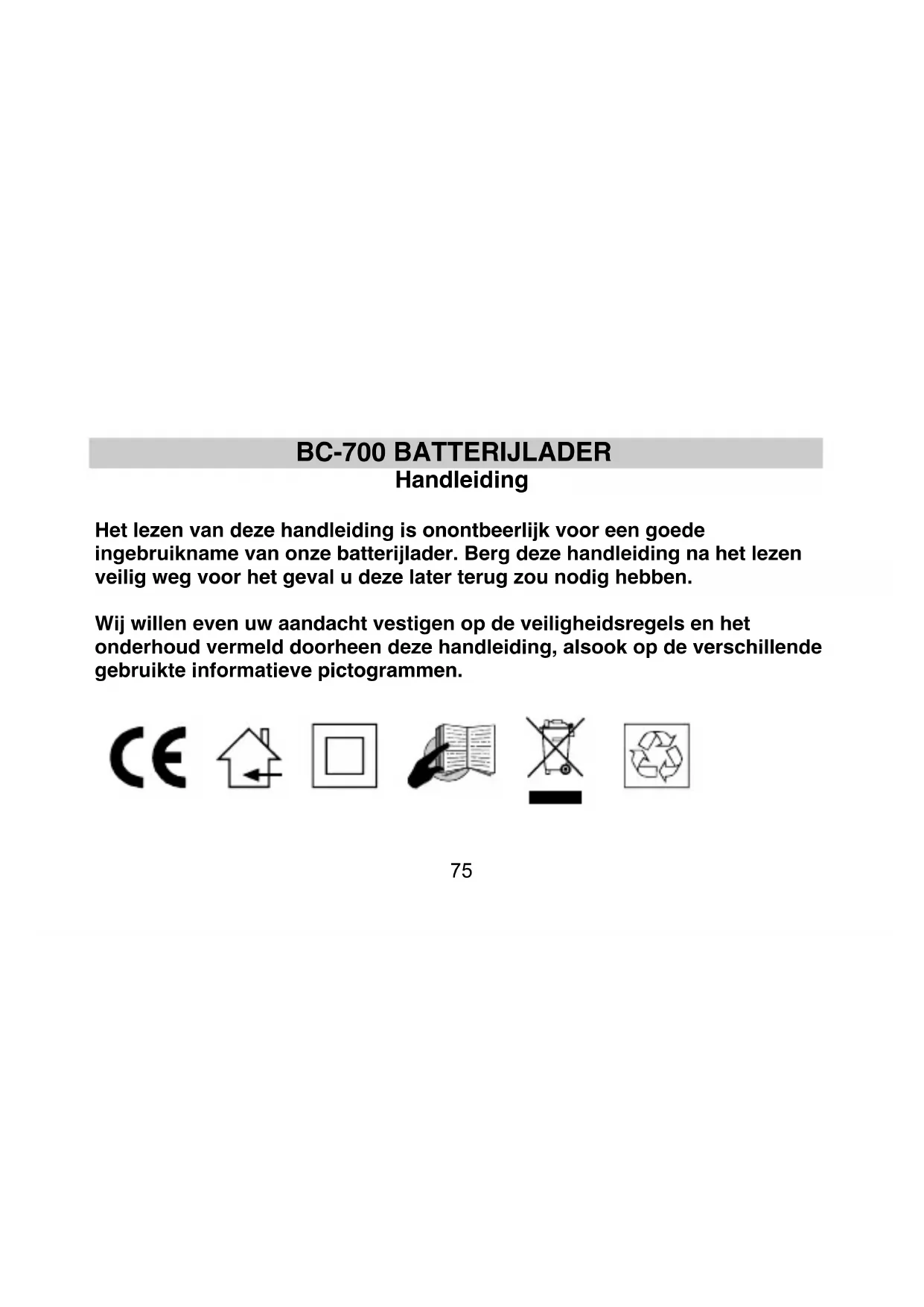 Verschillende bedrijfsstanden Weergave van verschillende bedrijfsstanden: Laadstroom, Laadtijd, Voltage en Capaciteit95 Table 5. Verschillende weergaven van de stand Ontladen Fase van ontladen Verschillende weergaveschermen (wisselen via DISPLAY-toets) Voltage (V) Stroom (mA) *Tijd (uu:mm) Capaciteit (mAh/ Ah) Tijdens ontladen Huidige voltage van batterij Ontlaadstroom Verstreken ontlaadtijd Capaciteit tijdens ontladen Tijdens laden Laadstroom Verstreken laadtijd Geaccumuleerde capaciteit Vol Stroomsterkte druppelladen96 Tabel 6. Verschillende weergaven van de stand Verversen Fase van verversen Verschillende weergaven (wisselen via DISPLAY-toets) Voltage (V) Stroom (mA) *Tijd (hh:mm) Capaciteit (mAh/ Ah) Tijdens ontladen Huidige voltage van batterij Ontlaadstroom Verstreken ontlaadtijd Capaciteit tijdens ontladen Tijdens laden Huidige voltage van batterij Laadstroom Verstreken laadtijd Tijdens laatste keer ontladen bepaalde capaciteit Vol Huidige voltage van batterij Stroom druppelladen Verstreken tijd van ontladen Maximale capaciteit van batterij bepaald bij ontladen97 Tabel 7. Verschillende weergaven van de stand Test Fase van teststand Verschillende weergaven (wisselen via DISPLAY-toets) Voltage (V) Stroom (mA) *Tijd (uu:mm) Capaciteit (mAh/ Ah) Tijdens laden Huidige voltage van batterij Charging current Verstreken laadtijd “--- mAh” Tijdens ontladen Ontlaadstroom Verstreken ontlaadtijd “--- mAh” Tijdens 2de keer laden Laadstroom Verstreken 2de laadtijd Capacity of the battery determined in discharging Vol Stroom van druppelladen Verstreken tijd van ontladen Capaciteit van de batterij bepaald bij ontladen98 Opgelet: z De timer zal worden vastgesteld om 19:59 na de verstreken tijd langer is dan 20 uur. z Als tijdens gebruik van de lader de stroom tijdelijk of langdurig wordt onderbroken, verspringt de bedrijfsstand automatisch op "Laden op 200mA" zodra de voeding weer normaal is; dit gebeurt ongeacht welke stand eerder door de gebruiker is ingesteld (laden, ontladen, verversen of testen). VERZORGING EN ONDERHOUD: z Vermijd extreme temperaturen, trillingen en schokken, want deze kunnen het toestel beschadigen. z Maak de schermen en behuizing enkel schoon met een zacht, vochtig doekje. Metalen delen van dit laadtoestel niet nat maken. Gebruik geen oplossingen of schuurmiddelen, want deze kunnen krassen op het LCD-scherm en de behuizing veroorzaken. z Geen water op het laadtoestel morsen. z Probeer de toestellen niet zelf te repareren. Lever het in bij het oorspronkelijke verkooppunt voor reparatie door een deskundig vakman. Door de toestellen te openen en eraan te prutsen kan de garantie komen te vervallen. z Stel de toestellen niet bloot aan extreme en plotselinge temperatuurswisselingen, want deze kunnen de elektronische delen in het toestel beschadigen.99 SPECIFICATIES: Ingangsspanning van netadapter : 100-240 VAC Maximale laadstroom : 200 mA - 700 mA Maximale laadcapaciteit (capaciteit van oplaadbare batterijen) : 3000 mAh Afmetingen (L x H x B) van laadtoestel : 130 x 75 x 40 mm BEPERKTE AANSPRAKELIJKHEID: z De fabrikant en leverancier aanvaarden geen enkele aansprakelijkheid voor oneigenlijk of incorrect gebruik en de gevolgen daarvan. z Onderhoud of reparaties uitgevoerd door anderen dan de oorspronkelijke leverancier maken de garantie ongeldig. z Dit product is enkel gebruiksgeschikt voor personen die deze handleiding gelezen en begrepen hebben. z De specificaties van dit product kunnen wijzigigen zonder voorgaande kennisgeving. z Dit product is geen speelgoed. Uit de buurt van kinderen houden. z Geen enkel deel van deze handleiding mag worden gereproduceerd zonder voorgaande schriftelijke toestemming van de fabrikant.100 IN ACHT NEMEN: De aandacht van de gebruiker wordt getrokken op de basisregels van de veiligheid bij het gebruik van een batterijlader. x Laadt enkel NiCd of NiMH batterijen zoals aangeduid in de paragraaf “AANDACHT”. x Gebruik de lader enkel binnenshuis en niet in een vochtige omgeving. Niet in water onderdompelen, niet bloot stellen aan regen of sneeuw; niet gebruiken in de omgeving van een warmtebron. Gooi gebruikte batterijen nooit in het vuur. x Gebruik geen toebehoren die niet geleverd zijn bij de batterijlader, zoals een AC/DC adapter. x Trek de AC/DC adapter uit het stopcontact indien de lader niet werkt. x Gebruik de lader niet opnieuw indien deze een val, schok of eender andere beschadiging opgelopen heeft. x Gebruik de lader niet voor andere doeleinden dan waarvoor hij geschikt is. x Ontmantel nooit de lader om het even voor welke reden dan ook: een verkeerde handeling kan de aanleiding zijn tot een elektriciteitprobleem of een brand.101 BC-700 CARICABATTERIE Manuale delle istruzioni PRIMA DI USARE IL CARICABATTERIE, LEGGERE ATTENTAMENTE TUTTE LE ISTRUZIONI CONTENUTE NEL PRESENTE MANUALE. CONSERVARE IL MANUALE IN UN POSTO SICURO PER FUTURE CONSULTAZIONI. Richiamiamo l'attenzione degli utilizzatori di questo apparecchio: per favore seguire le istruzioni di sicurezza e di manutenzione che sono parte di questo manuale. Inoltre si prega di leggere le indicazioni sul caricabatterie, il manuale e la confezione.102 INTRODUZIONE Congratulazioni per l'acquisto di questo caricabatterie intelligente, che permette una ricarica veloce e ottimale delle batterie ricaricabili tipo “AA” e “AAA”. L'apparecchio dispone delle funzioni di ricarica, scarica, refresh e di test della capacità delle batterie, nonché un display a cristalli liquidi LCD per i compartimenti di ricarica. Quest’unità di ricarica è affidabile, facile da usare e ideale per uso domestico, professionale o da viaggio. CONTENUTO DELL'IMBALLAGGIO