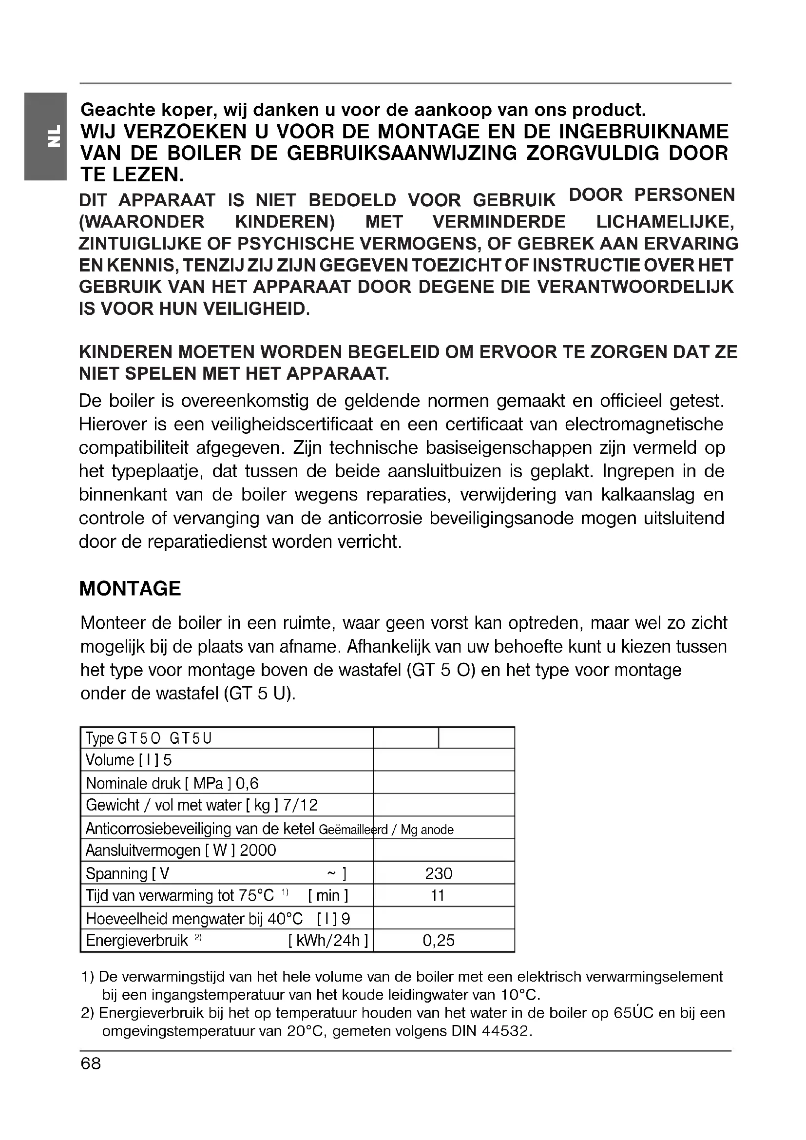 Geachte koper, wij danken u voor de aankoop van ons product. WIJ VERZOEKEN U VOOR DE MONTAGE EN DE INGEBRUIKNAME VAN DE BOILER DE GEBRUIKSAANWIJZING ZORGVULDIG DOOR TE LEZEN. De boiler is overeenkomstig de geldende normen gemaakt en officieel getest. Hierover is een veiligheidscertificaat en een certificaat van electromagnetische compatibiliteit afgegeven. Zijn technische basiseigenschappen zijn vermeld op het typeplaatje, dat tussen de beide aansluitbuizen is geplakt. Ingrepen in de binnenkant van de boiler wegens reparaties, verwijdering van kalkaanslag en controle of vervanging van de anticorrosie beveiligingsanode mogen uitsluitend door de reparatiedienst worden verricht. MONTAGE Monteer de boiler in een ruimte, waar geen vorst kan optreden, maar wel zo zicht mogelijk bij de plaats van afname. Afhankelijk van uw behoefte kunt u kiezen tussen