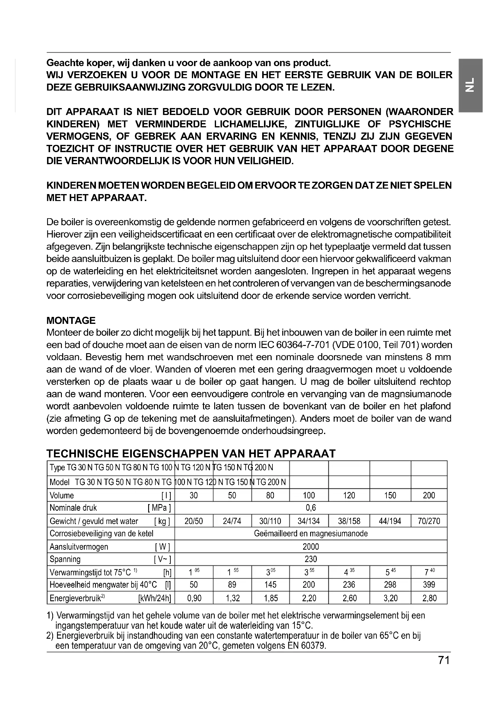 Geachte koper, wij danken u voor de aankoop van ons product. WIJ VERZOEKEN U VOOR DE MONTAGE EN HET EERSTE GEBRUIK VAN DE BOILER DEZE GEBRUIKSAANWIJZING ZORGVULDIG DOOR TE LEZEN. DIT APPARAAT IS NIET BEDOELD VOOR GEBRUIK DOOR PERSONEN (WAARONDER KINDEREN) MET VERMINDERDE LICHAMELIJKE, ZINTUIGLIJKE OF PSYCHISCHE VERMOGENS, OF GEBREK AAN ERVARING EN KENNIS, TENZIJ ZIJ ZIJN GEGEVEN TOEZICHT OF INSTRUCTIE OVER HET GEBRUIK VAN HET APPARAAT DOOR DEGENE DIE VERANTWOORDELIJK IS VOOR HUN VEILIGHEID. KINDEREN MOETEN WORDEN BEGELEID OM ERVOOR TE ZORGEN DAT ZE NIET SPELEN MET HET APPARAAT. De boiler is overeenkomstig de geldende normen gefabriceerd en volgens de voorschriften getest. Hierover zijn een veiligheidscertifi caat en een certifi caat over de elektromagnetische compatibiliteit afgegeven. Zijn belangrijkste technische eigenschappen zijn op het typeplaatje vermeld dat tussen beide aansluitbuizen is geplakt. De boiler mag uitsluitend door een hiervoor gekwalifi ceerd vakman op de waterleiding en het elektriciteitsnet worden aangesloten. Ingrepen in het apparaat wegens reparaties, verwijdering van ketelsteen en het controleren of vervangen van de beschermingsanode voor corrosiebeveiliging mogen ook uitsluitend door de erkende service worden verricht. MONTAGE Monteer de boiler zo dicht mogelijk bij het tappunt. Bij het inbouwen van de boiler in een ruimte met een bad of douche moet aan de eisen van de norm IEC 60364-7-701 (VDE 0100, Teil 701) worden voldaan. Bevestig hem met wandschroeven met een nominale doorsnede van minstens 8 mm aan de wand of de vloer. Wanden of vloeren met een gering draagvermogen moet u voldoende versterken op de plaats waar u de boiler op gaat hangen. U mag de boiler uitsluitend rechtop aan de wand monteren. Voor een eenvoudigere controle en vervanging van de magnsiumanode wordt aanbevolen voldoende ruimte te laten tussen de bovenkant van de boiler en het plafond (zie afmeting G op de tekening met de aansluitafmetingen). Anders moet de boiler van de wand worden gedemonteerd bij de bovengenoemde onderhoudsingreep.