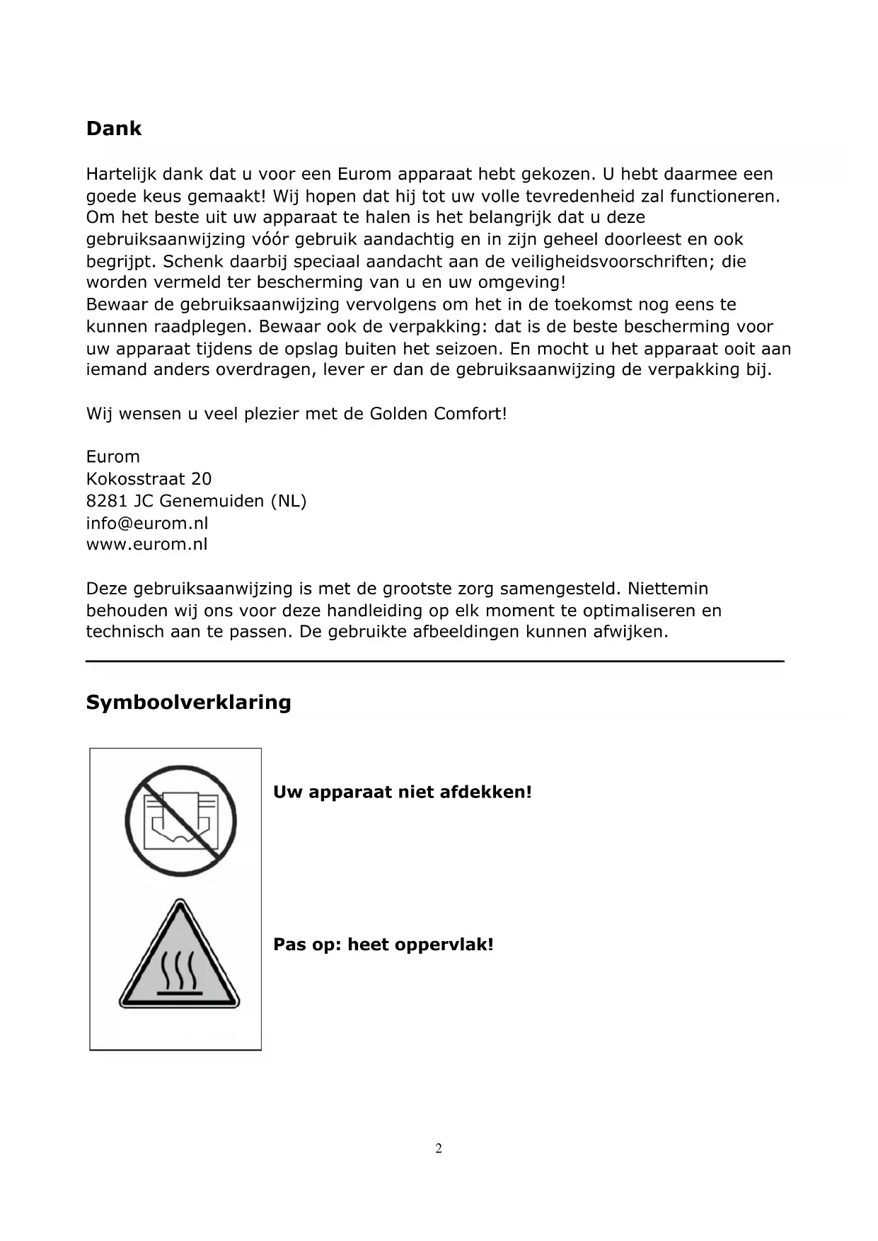 Hartelijk dank dat u voor een Eurom apparaat hebt gekozen. U hebt daarmee een goede keus gemaakt! Wij hopen dat hij tot uw volte tevredenheid zal functioneren. Om het Beste uit uw apparaat te halen is het belangrijk dat u deze gebruiksaanwijzing voor gebruik aandachtig en in+zijn geheel doorleest en ook begrijpt. Schenk waar bij special aandacht aan de veiligheidsvoorschriften; die worden vermeld ter bescherming van u en uw omgeving!