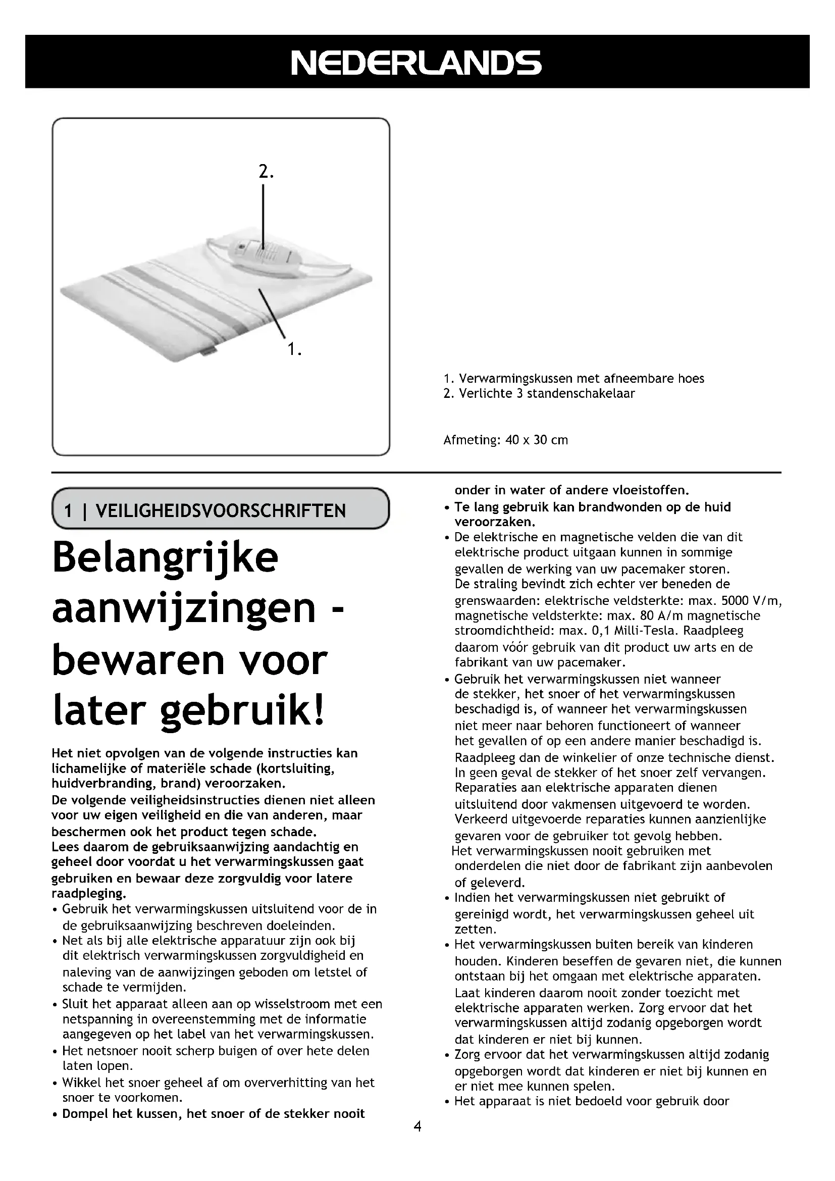 - Het verwarmingskussen mag Niet door kinderen worden gebruikt, behalte wanner de schakelaar door een van de ouders of een andere volwassene van tevoren is ingesteld of het kind goed geinstrueerd is in veilig gebruik van het verwarmingskussen.