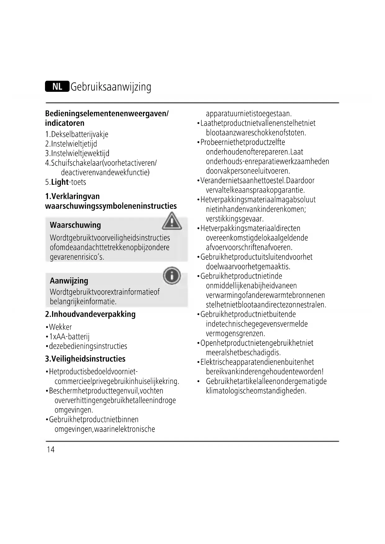 Gebruik het artikel alleen onder gematigde klimatologische omstandigheden. N Gebruiksaanwijzing15 Waarschuwing – batterijen