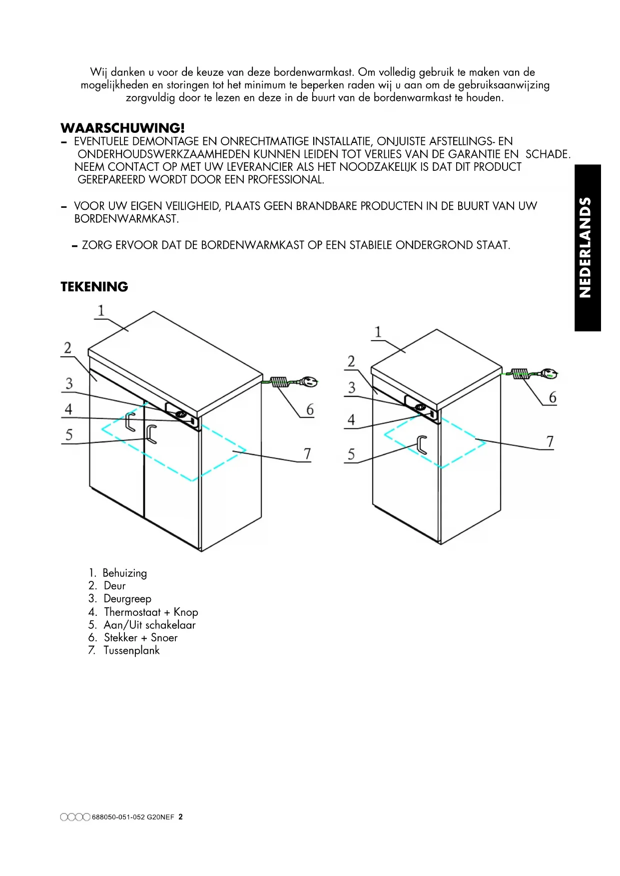 - VOOR UW EIGEN VEILIGHEID, PLAATS GEEN BRANDBARE PRODUCTEN IN DE BUURT VAN UW BORDENWARMKAST.