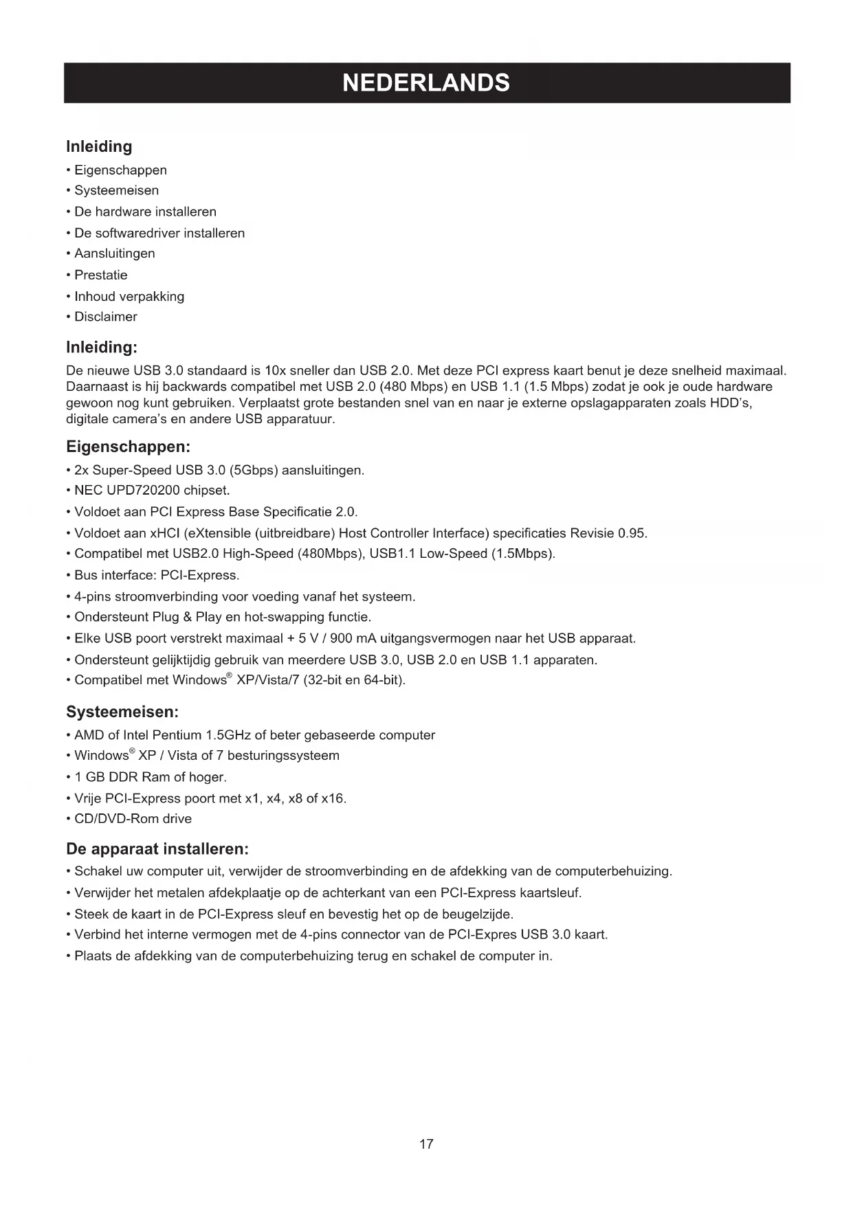 PCI- E Ver1.0/1.1 PCI- E Ver2.0 USB 3.0 Card USB 3.0 Card USB Apparaten USB Apparaten >150MB/ sec >300MB/ sec Gebruik a.u.b. de PCI Express Ver 2.0 poort voor een USB 3.0 gegevensoverdracht met een snelheid van 5.0 Gbps. Inhoud verpakking: