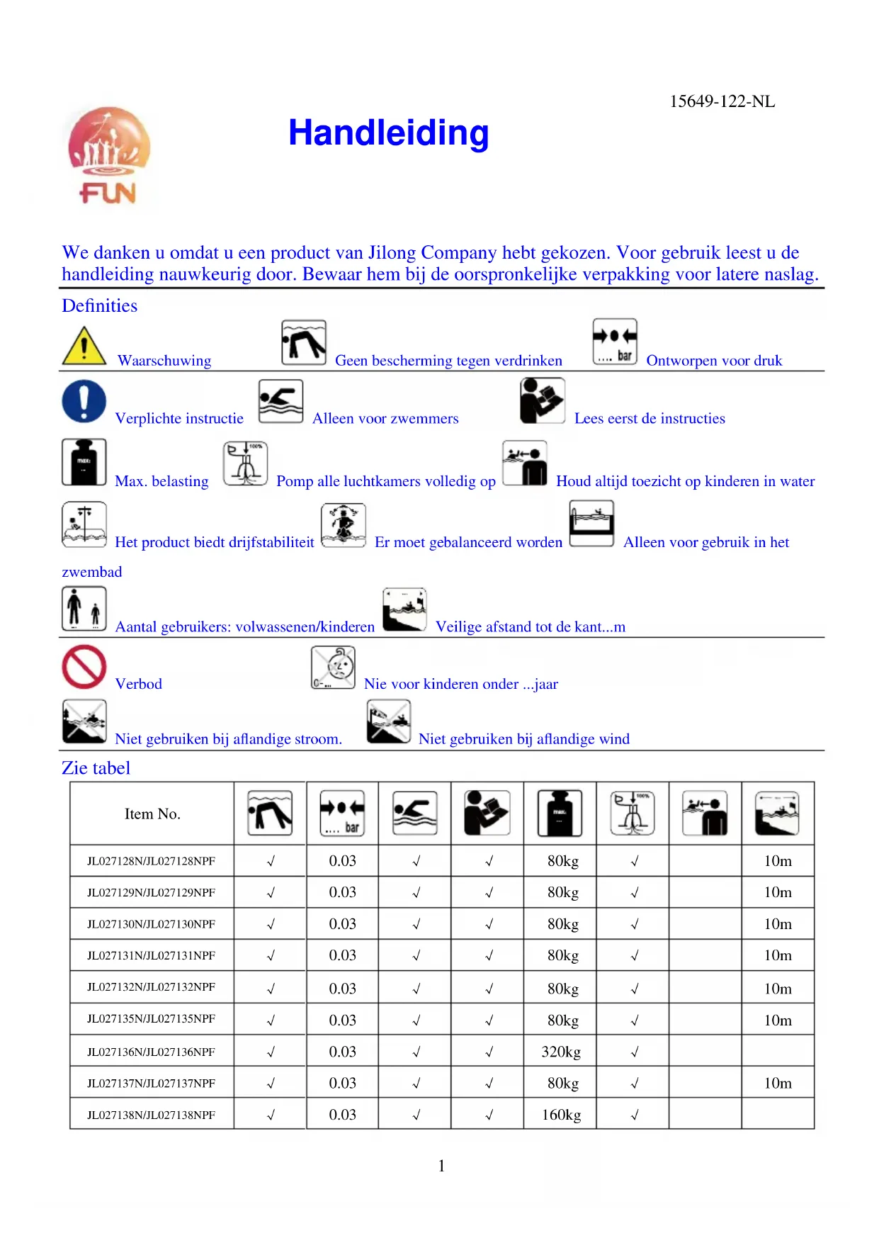 We danken u omdat u een product van Jilong Company hebt gekozen. Voor gebruik leest u de handleiding nauwkeurig door. Bewaar hem bij de oorspronkelijke verpakking voor latere naslag. Definities Waarschuwing Geen bescherming tegen verdrinken Ontworpen voor druk Verplichte instructie Alleen voor zwemmers Lees eerst de instructies Max. belasting Pomp alle luchtkamers volledig op Houd altijd toezicht op kinderen in water Het product biedt drijfstabiliteit Er moet gebalanceerd worden Alleen voor gebruik in het zwembad Aantal gebruikers: volwassenen/kinderen Veilige afstand tot de kant...m Verbod Nie voor kinderen onder ...jaar Niet gebruiken bij aflandige stroom. Niet gebruiken bij aflandige wind Zie tabel Item No.