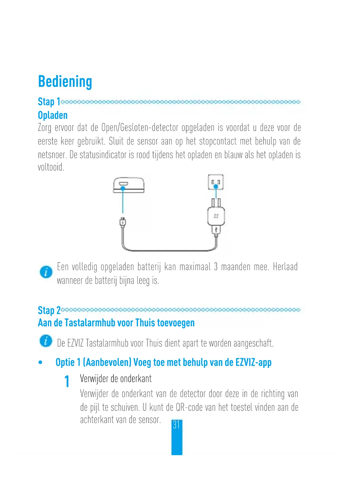 10dBm Pulsante Connettore di carica LED Lampeggia in blu una volta: La porta o la finestra torna in stato chiuso. Lampeggia in rosso una volta: La porta o la finestra è aperta. Base31 Bediening Stap 1 Opladen Zorg ervoor dat de Open/Gesloten-detector opgeladen is voordat u deze voor de eerste keer gebruikt. Sluit de sensor aan op het stopcontact met behulp van de netsnoer. De statusindicator is rood tijdens het opladen en blauw als het opladen is voltooid. Een volledig opgeladen batterij kan maximaal 3 maanden mee. Herlaad wanneer de batterij bijna leeg is. Stap 2 Aan de Tastalarmhub voor Thuis toevoegen De EZVIZ Tastalarmhub voor Thuis dient apart te worden aangeschaft.