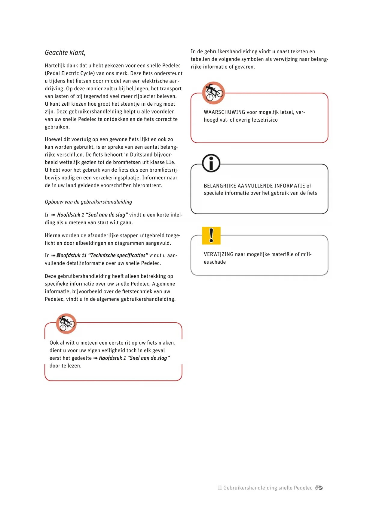 Hoofdstuk 11 “Technische specificaties” vindt u aan- vullende detailinformatie over uw snelle Pedelec. Deze gebruikershandleiding hee alleen betrekking op specieke informatie over uw snelle Pedelec. Algemene informatie, bijvoorbeeld over de etstechniek van uw Pedelec, vindt u in de algemene gebruikershandleiding. Ook al wilt u meteen een eerste rit op uw ets maken, dient u voor uw eigen veiligheid toch in elk geval eerst het gedeelte