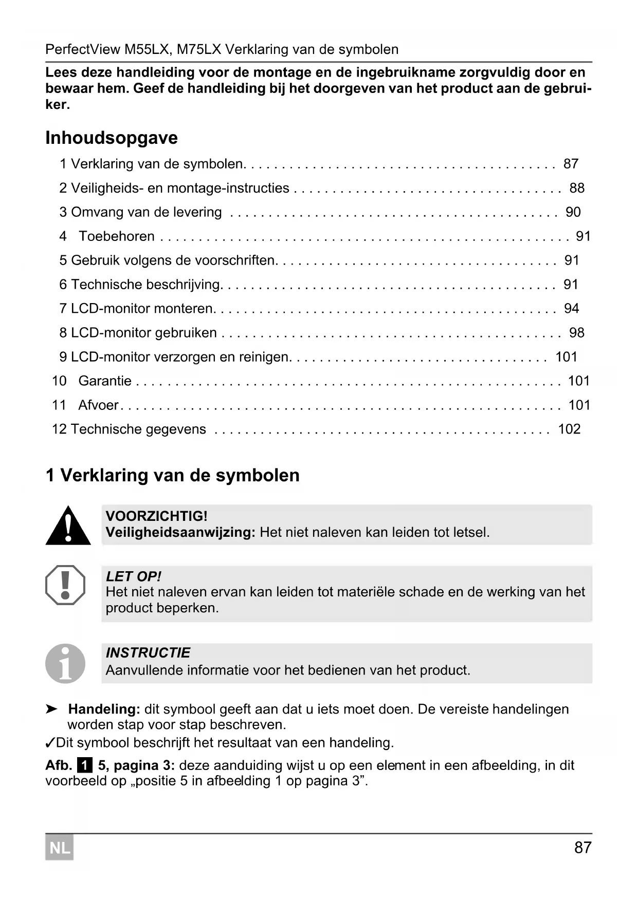 ➤ Handeling: dit symbool geeft aan dat u iets moet doen. De vereiste handelingen worden stap voor stap beschreven. ✓ Dit symbool beschrijft het resultaat van een handeling. Afb. 1 5, pagina 3: deze aanduiding wijst u op een element in een afbeelding, in dit voorbeeld op „positie 5 in afbeelding 1 op pagina 3”. VOORZICHTIG! Veiligheidsaanwijzing: Het niet naleven kan leiden tot letsel. LET OP! Het niet naleven ervan kan leiden tot materiële schade en de werking van het product beperken. INSTRUCTIE Aanvullende informatie voor het bedienen van het product.Veiligheids- en montage-instructies PerfectView M55LX, M75LX