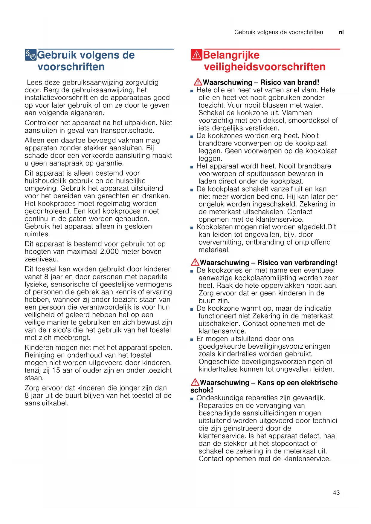 8Gebruik volgens de voorschriften Gebr ui k vol gens de voor schr i f t en Lees deze gebruiksaanwijzing zorgvuldig door. Berg de gebruiksaanwijzing, het installatievoorschrift en de apparaatpas goed op voor later gebruik of om ze door te geven aan volgende eigenaren. Controleer het apparaat na het uitpakken. Niet aansluiten in geval van transportschade. Alleen een daartoe bevoegd vakman mag apparaten zonder stekker aansluiten. Bij schade door een verkeerde aansluiting maakt u geen aanspraak op garantie. Dit apparaat is alleen bestemd voor huishoudelijk gebruik en de huiselijke omgeving. Gebruik het apparaat uitsluitend voor het bereiden van gerechten en dranken. Het kookproces moet regelmatig worden gecontroleerd. Een kort kookproces moet continu in de gaten worden gehouden. Gebruik het apparaat alleen in gesloten ruimtes. Dit apparaat is bestemd voor gebruik tot op hoogten van maximaal 2.000 meter boven zeeniveau. Dit toestel kan worden gebruikt door kinderen vanaf 8 jaar en door personen met beperkte fysieke, sensorische of geestelijke vermogens of personen die gebrek aan kennis of ervaring hebben, wanneer zij onder toezicht staan van een persoon die verantwoordelijk is voor hun veiligheid of geleerd hebben het op een veilige manier te gebruiken en zich bewust zijn van de risico's die het gebruik van het toestel met zich meebrengt. Kinderen mogen niet met het apparaat spelen. Reiniging en onderhoud van het toestel mogen niet worden uitgevoerd door kinderen, tenzij zij 15 aar of ouder zijn en onder toezicht staan. Zorg ervoor dat kinderen die jonger zijn dan 8 jaar uit de buurt blijven van het toestel of de aansluitkabel. (Belangrijke veiligheidsvoorschriften Be l an g r i j k e vei l i ghei dsvoor s chr i f t en :Waarschuwing – Risico van brand! ■ Hete olie en heet vet vatten snel vlam. Hete olie en heet vet nooit gebruiken zonder toezicht. Vuur nooit blussen met water. Schakel de kookzone uit. Vlammen voorzichtig met een deksel, smoordeksel of iets dergelijks verstikken. Risico van brand! ■ De kookzones worden erg heet. Nooit brandbare voorwerpen op de kookplaat leggen. Geen voorwerpen op de kookplaat leggen. Risico van brand! ■ Het apparaat wordt heet. Nooit brandbare voorwerpen of spuitbussen bewaren in laden direct onder de kookplaat. Risico van brand! ■ De kookplaat schakelt vanzelf uit en kan niet meer worden bediend. Hij kan later per ongeluk worden ingeschakeld. Zekering in de meterkast uitschakelen. Contact opnemen met de klantenservice. Gevaar voor verbranding! ■ Kookplaten mogen niet worden afgedekt.Dit kan leiden tot ongevallen, bijv. door oververhitting, ontbranding of ontploffend materiaal. :Waarschuwing – Risico van verbranding! ■ De kookzones en met name een eventueel aanwezige kookplaatomlijsting worden zeer heet. Raak de hete oppervlakken nooit aan. Zorg ervoor dat er geen kinderen in de buurt zijn. Risico van verbranding! ■ De kookzone warmt op, maar de indicatie functioneert niet Zekering in de meterkast uitschakelen. Contact opnemen met de klantenservice. Gevaar voor verbranding! ■ Er mogen uitsluitend door ons goedgekeurde beveiligingsvoorzieningen zoals kindertralies worden gebruikt. Ongeschikte beveiligingsvoorzieningen of kindertralies kunnen tot ongevallen leiden. :Waarschuwing – Kans op een elektrische schok! ■ Ondeskundige reparaties zijn gevaarlijk. Reparaties en de vervanging van beschadigde aansluitleidingen mogen uitsluitend worden uitgevoerd door technici die zijn geïnstrueerd door de klantenservice. Is het apparaat defect, haal dan de stekker uit het stopcontact of schakel de zekering in de meterkast uit. Contact opnemen met de klantenservice. Kans op een elektrische schok!nl Oorzaken van schade