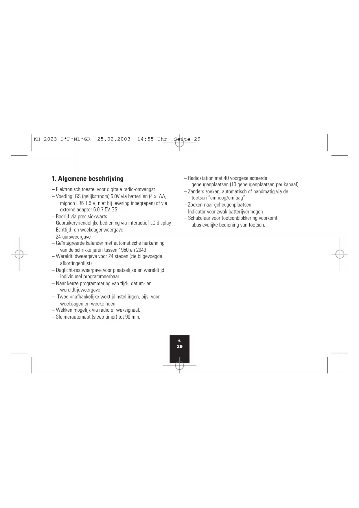 – Elektronisch toestel voor digitale radio-ontvangst – Voeding: GS (gelijkstroom) 6.0V via batterijen (4 x AA, mignon LR6 1,5 V, niet bij levering inbegrepen) of via externe adapter 6.0-7.5V GS – Bedrijf via precisiekwarts – Gebruikervriendelijke bediening via interactief LC-display – Echttijd- en weekdagenweergave – 24-uursweergave – Geïntegreerde kalender met automatische herkenning van de schrikkeljaren tussen 1950 en 2049 – Wereldtijdweergave voor 24 steden (zie bijgevoegde afkortingenlijst) – Daglicht-restweergave voor plaatselijke en wereldtijd individueel programmeerbaar. – Naar keuze programmering van tijd-, datum- en wereldtijdweergave. – Twee onafhankelijke wektijdinstellingen, bijv. voor weekdagen en weekeinden – Wekken mogelijk via radio of weksignaal. – Sluimerautomaat (sleep timer) tot 90 min. – Radiostation met 40 voorgeselecteerde geheugenplaatsen (10 geheugenplaatsen per kanaal) – Zenders zoeken, automatisch of handmatig via de toetsen “omhoog/omlaag” – Zoeken naar geheugenplaatsen – Indicator voor zwak batterijvermogen – Schakelaar voor toetsenblokkering voorkomt abusievelijke bediening van toetsen. KH_2023_D*F*NL*GR 25.02.2003 14:55 Uhr Seite 2930