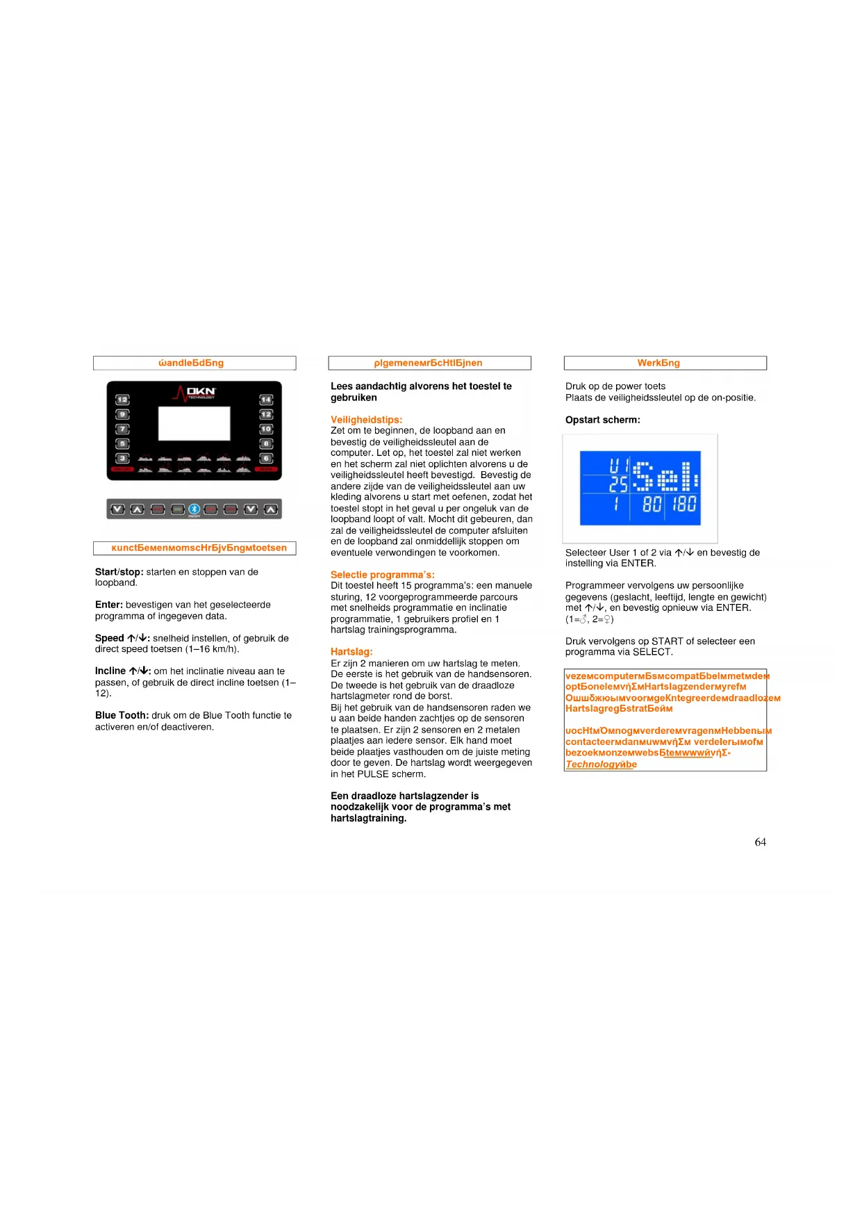 Houd bij het op -en van de loopband stappen altijd de handgrepen vast. Plaats uw voeten eerst op de zijkant van het apparaat (niet op de band) voordat u gaat lopen. Start de loopband en stel deze (voordat u erop staat) in op een lage snelheid. Pas de snelheid langzaam aan zodat u niet onaangenaam verrast wordt door een snel looptempo. Schakel het apparaat altijd uit voordat onderhoud of afstelwerkzaamheden worden verricht. Verwijder het motordeksel ten minste eenmaal per jaar en reinig het binnencompartiment met een stofzuiger. Onderhoudswerkzaamheden die niet in deze handleiding worden beschreven, mogen alleen door erkend onderhoudspersoneel worden uitgevoerd.