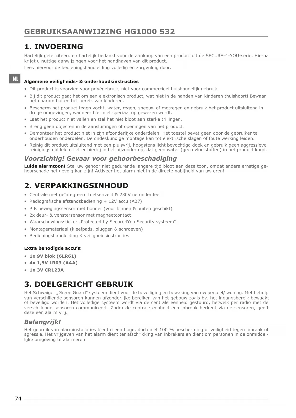 Het Schwaiger „Green Guard“ systeem dient voor de beveiliging en bewaking van uw perceel/ woning. Met behulp van verschillende sensoren kunnen afzonderlijke bereiken van het gebouw zoals bv. het ingangsbereik bewaakt of beveiligd worden. Het volledige systeem wordt via de centrale eenheid gestuurd, hetwelk per radio met de verschillende sensoren communiceert. Zodra de centrale eenheid een inbreuk herkent via de sensoren, geeft deze een alarm vrij. Belangrijk! Het gebruik van alarminstallaties biedt u een hoge, doch niet 100 % bescherming of veiligheid tegen inbraak of agressie. Het vrijgeven van het alarm dient ter afschrikking van inbrekers en dient om personen in de onmiddel- lijke omgeving te alarmeren.75 GEBRUIKSAANWIJZING HG1000 532