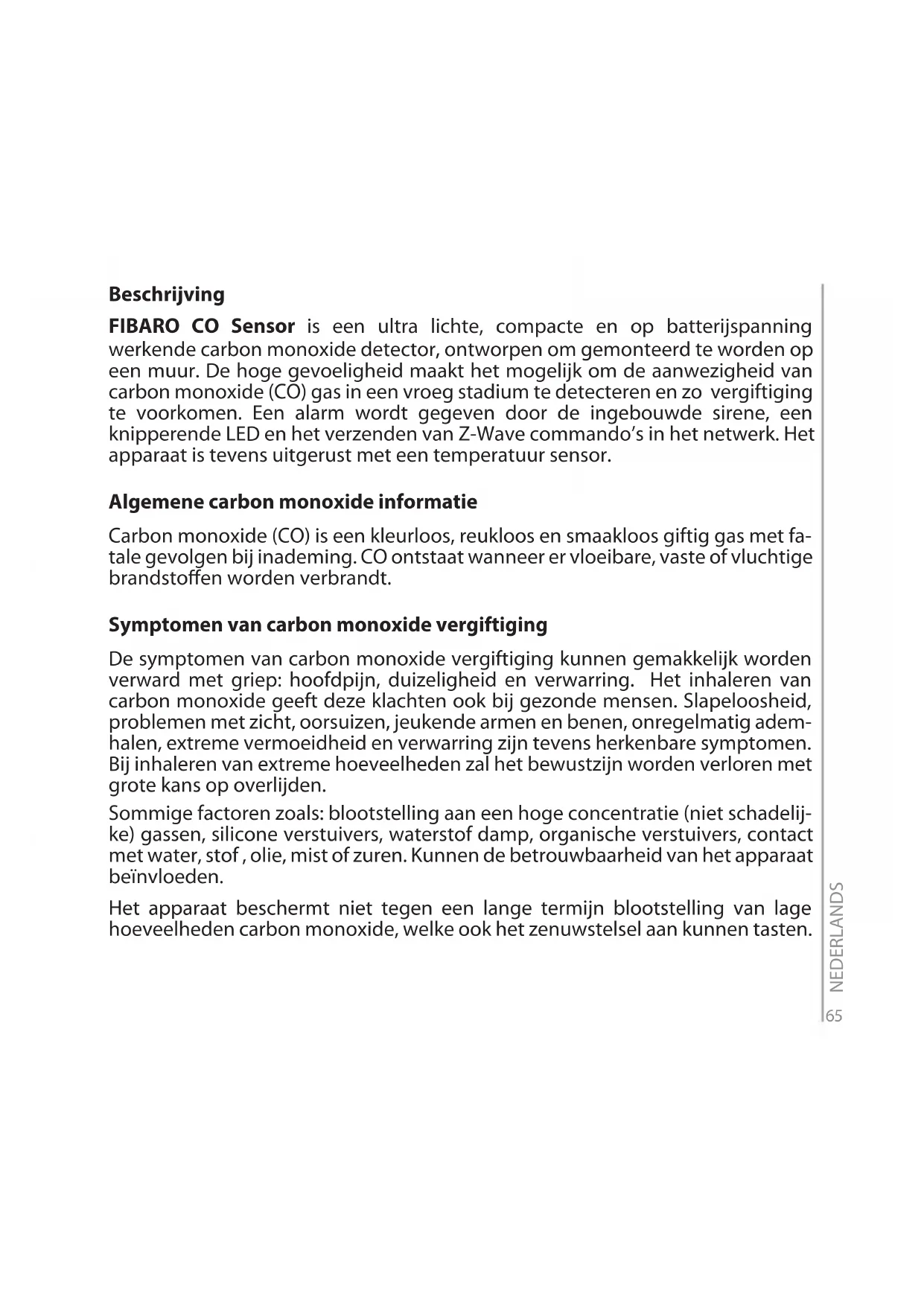 duttore non è responsabile per danni indiretti, incidentali, speciali, consequenziali o morali, né per danni derivanti dalla perdita di protti, risparmi, dati, perdita di beneci, pretese di terzi o altri danni derivanti o legati all’uso del Dispositivo. ITALIANO65 Beschrijving FIBARO CO Sensor is een ultra lichte, compacte en op batterijspanning werkende carbon monoxide detector, ontworpen om gemonteerd te worden op een muur. De hoge gevoeligheid maakt het mogelijk om de aanwezigheid van carbon monoxide (CO) gas in een vroeg stadium te detecteren en zo vergiftiging te voorkomen. Een alarm wordt gegeven door de ingebouwde sirene, een knipperende LED en het verzenden van Z-Wave commando’s in het netwerk. Het apparaat is tevens uitgerust met een temperatuur sensor. Algemene carbon monoxide informatie Carbon monoxide (CO) is een kleurloos, reukloos en smaakloos giftig gas met fa- tale gevolgen bij inademing. CO ontstaat wanneer er vloeibare, vaste of vluchtige brandstoen worden verbrandt. Symptomen van carbon monoxide vergiftiging De symptomen van carbon monoxide vergiftiging kunnen gemakkelijk worden verward met griep: hoofdpijn, duizeligheid en verwarring. Het inhaleren van carbon monoxide geeft deze klachten ook bij gezonde mensen. Slapeloosheid, problemen met zicht, oorsuizen, jeukende armen en benen, onregelmatig adem- halen, extreme vermoeidheid en verwarring zijn tevens herkenbare symptomen. Bij inhaleren van extreme hoeveelheden zal het bewustzijn worden verloren met grote kans op overlijden. Sommige factoren zoals: blootstelling aan een hoge concentratie (niet schadelij- ke) gassen, silicone verstuivers, waterstof damp, organische verstuivers, contact met water, stof , olie, mist of zuren. Kunnen de betrouwbaarheid van het apparaat beïnvloeden. Het apparaat beschermt niet tegen een lange termijn blootstelling van lage hoeveelheden carbon monoxide, welke ook het zenuwstelsel aan kunnen tasten. NEDERLANDS66 Waarschuwingen Het nalaten van de aanbevelingen in deze handleiding kan een levensbedrei- gend risico veroorzaken of resulteren in een defect apparaat. De fabrikant zal geen aansprakelijkheid aanvaarden worden voor verlies of scha- de voortvloeiend uit het niet volgen van de instructies in de handleidingen. Aanpassingen aan het apparaat kunnen resulteren in een storing. Het apparaat moet beneden het plafond geplaatst worden. Het apparaat mag nooit geplaatst worden: in een badkamer, naast een hittebron, binnen het directe bereik van kinderen, in direct zonlicht of op plaatsen waar eventueel aanwezig carbon monoxide gas het apparaat niet kan bereiken. Het apparaat is geen vervanging voor ventilatie en afvoersystemen. Verf het apparaat niet. Het apparaat kan worden gereinigd met een vochtige doek of tissue. Vervang het apparaat voor de aangegeven datum op de voorkant of wanneer een sensor fout is geconstateerd. Het product is geen speelgoed. Houd kinderen en dieren weg! PAS OP: explosiegevaar als u de batterij vervangt door een batterij van een on- juist type. Volg de instructies voor het verwijderen van verbruikte batterijen. PAS OP: Het toestel kan de chronische eecten van blootstelling aan koolmonox- ide niet voorkomen. Het toestel biedt geen volledige bescherming voor perso- nen met een verhoogd risico. De functie voor het op afstand uitschakelen van het alarm mag alleen worden gebruikt in het zicht van het toestel. Indien er twijfel bestaat over de oorzaak van een alarm, moet worden aange- nomen dat het alarm te wijten is aan een gevaarlijk koolmonoxideniveau en moet de woning worden ontruimd. NEDERLANDS67 NEDERLANDS Plaats voor montage (pagina 4) Plaats het apparaat op een muur, minimaal 30 cm uit de hoek. De aanbevolen montagehoogte is afhankelijk van het gebruik van de kamer waarbij de melder op gezichtshoogte geplaatst dien te worden. Installatie (pagina 6/7)