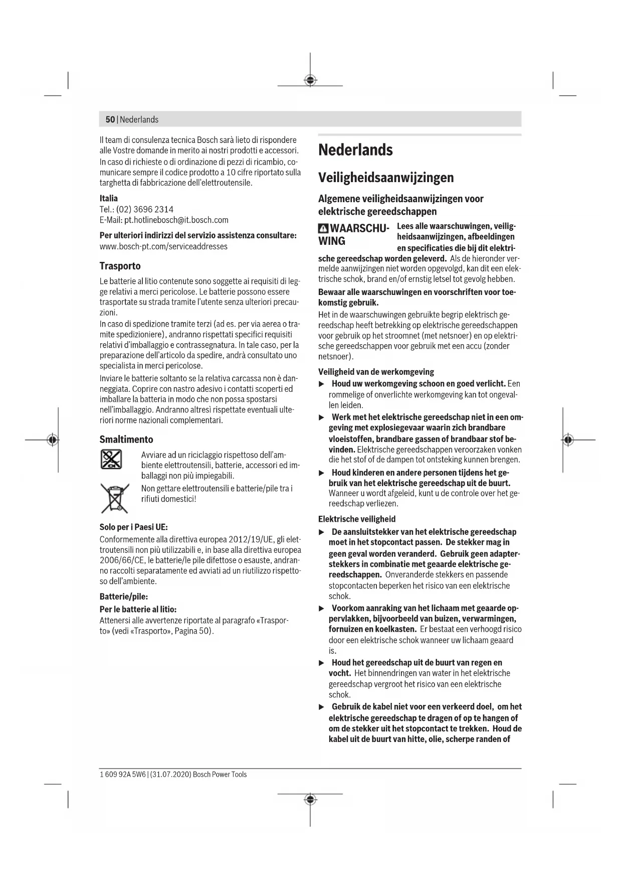Il livello di vibrazione ed il valore di emissione acustica indi- cati nelle presenti istruzioni sono stati rilevati conformemen- te ad una procedura di misurazione unificata e sono utilizza- bili per confrontare gli elettroutensili. Le stesse procedure sono idonee anche per una valutazione temporanea del livel- lo di vibrazione e dell’emissione acustica. Il livello di vibrazione ed il valore di emissione acustica sono riferiti agli impieghi principali dell’elettroutensile; qualora, tuttavia, l’elettroutensile venisse utilizzato per altre applica- zioni, oppure con accessori differenti o in caso di insufficien- te manutenzione, il livello di vibrazione ed il valore di emis- sione acustica potrebbero variare. Ciò potrebbe aumentare sensibilmente l’emissione di vibrazioni e l’emissione acustica sull’intero periodo di funzionamento. Per valutare con precisione i valori di vibrazione e di emissio- ne acustica, andranno considerati anche i periodi nei quali l’utensile sia spento, oppure acceso, ma non utilizzato. Ciò potrebbe ridurre sensibilmente l’emissione di vibrazioni e l’emissione acustica sull’intero periodo di funzionamento. Adottare misure di sicurezza supplementari per proteggere l’operatore dall’effetto delle vibrazioni: ad esempio, sottopo- nendo a manutenzione l’elettroutensile e gli utensili accesso- ri, mantenendo calde le mani e organizzando i vari processi di lavoro. Montaggio Ricarica della batteria u Utilizzare esclusivamente i caricabatterie indicati nei dati tecnici. Soltanto questi caricabatterie sono adatti al- le batterie al litio utilizzate nell’elettroutensile. Avvertenza: La batteria viene fornita solo parzialmente cari- ca. Per garantire l’intera potenza della batteria, prima dell’impiego iniziale, ricaricare completamente la batteria nell’apposito caricabatteria. La batteria al litio può essere ricaricata in qualsiasi momento senza ridurne la durata. Un’interruzione dell’operazione di ri- carica non danneggia la batteria. La batteria al litio è protetta contro lo scaricamento comple- to dal sistema «Electronic Cell Protection (ECP)». In caso di batteria scarica l’elettroutensile si spegne attraverso un in- terruttore automatico: l’accessorio non si muove più. u Dopo lo spegnimento automatico dell’elettroutensile, non premere ulteriormente l’interruttore di avvio/ar- resto. La batteria potrebbe subire danni. Rimozione della batteria ricaricabile Per la rimozione della batteria premere il tasto di sbloccag- gio ed estrarre la batteria dall’elettroutensile tirandola all’in- dietro. Durante questa operazione, non esercitare forza. Indicatore del livello di carica della batteria L’indicatore del livello di carica della batteria (13), a tasto di accensione/spegnimento (14) completamente o parzial- mente premuto, indica per alcuni secondi il livello di carica della batteria ed è costituito da 3 LED di colore verde. LED Autonomia Luce fissa, 3LED verdi ≥ 66% Luce fissa, 2 LED verdi 33 – 66% Luce fissa, 1 LED verde 11 – 33% Lampeggio lento, 1 LED verde ≤ 10% I 3 LED dell’indicatore del livello di carica della batteria lampeggeranno velocemente quando la temperatura del- la batteria si troverà fuori dal campo di funzionamento, tra –30 e +65 °C, e/o quando la protezione contro il so- vraccarico sarà intervenuta. Cambio degli utensili Introduzione dell’utensile accessorio (vedere fig. A) Introdurre l’utensile fino a battuta nel portautensile (2). L’utensile viene mantenuto in posizione nel portautensile mediante un apposito magnete. Smontaggio dell’utensile accessorio Estrarre l'utensile dal portautensile (2). Montare la testa (vedere figura B) Rimuovere l’accessorio. Innestare la testa nel portautensile (2). L’accessorio inneste- rà in modo udibile in sede. Verificare che la testa sia saldamente inserita in sede, eserci- tando trazione sulla testa stessa. Introduzione dell’utensile nella testa (vedere figura C) Introdurre l’utensile fino a battuta nella testa. L'utensile vie- ne trattenuto nella testa mediante magnete. Bosch Power Tools 1 609 92A 5W6 | (31.07.2020)48 | Italiano Portaviti (vedere figura D) Con il portaviti (16) le viti vengono stabilizzate, in modo che possano essere applicate meglio sul pezzo in lavorazione. Rimuovere l’accessorio. Innestare il portaviti sul portautensile (2), fino a che questo non scatta percettibilmente in sede. Premere il tappo ma- gnetico (15) fino a battuta in direzione dell'elettroutensile. Inserire infine il bit di avvitamento (20) sul portaviti (16) e tirare il tappo magnetico in avanti attraverso il bit di avvita- mento. Inserire una vite sul bit di avvitamento. Mandrino autoserrante (vedere figura E) Aprire il mandrino autoserrante (18) ruotando nel senso di rotazione ➊, fino a che l'utensile possa essere inserito. Intro- durre l’utensile accessorio. Chiudere manualmente, ruotando con forza, la bussola del mandrino autoserrante (18) nel senso di rotazione ➋. In questo modo il mandrino si blocca automaticamente. Ruotare la testa (vedere figura F) Estrarre la ghiera di sbloccaggio (1) dall'elettroutensile e successivamente rimuovere la testa dal portautensile (2). Ruotare l’accessorio nella posizione desiderata, quindi inne- starlo nuovamente. Verificare che la testa sia saldamente inserita in sede, eserci- tando trazione sulla testa stessa. Smontaggio della testa (vedere figura G) Rimuovere l’accessorio. Estrarre la ghiera di sbloccaggio (1) dall'elettroutensile e ri- muovere la testa dal portautensile (2). Impiego combinato delle teste (vedere figura H) Rimuovere l’accessorio. Innestare la testa ad angolo (17) sul portautensile (2). Controllare il saldo alloggiamento tirando la testa ad angolo (17). Innestare il mandrino autoserrante (18) sulla testa ad angolo (17). Controllare il saldo alloggiamento tirando il mandrino auto- serrante (18). Aspirazione polvere/aspirazione trucioli Polveri e materiali come vernici contenenti pio