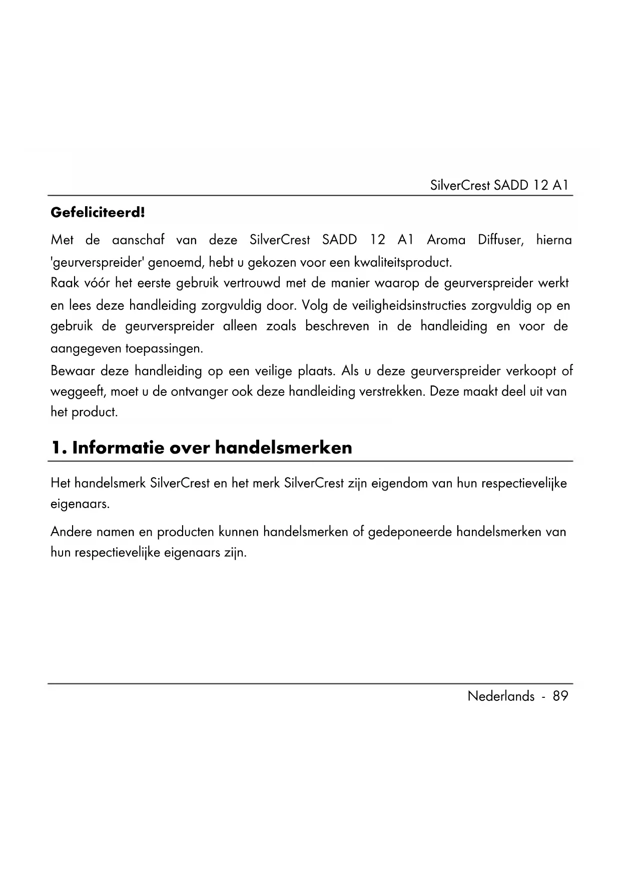 Nederlands - 89 Gefeliciteerd! Met de aanschaf van deze SilverCrest SADD 12 A1 Aroma Diffuser, hierna 'geurverspreider' genoemd, hebt u gekozen voor een kwaliteitsproduct. Raak vóór het eerste gebruik vertrouwd met de manier waarop de geurverspreider werkt en lees deze handleiding zorgvuldig door. Volg de veiligheidsinstructies zorgvuldig op en gebruik de geurverspreider alleen zoals beschreven in de handleiding en voor de aangegeven toepassingen. Bewaar deze handleiding op een veilige plaats. Als u deze geurverspreider verkoopt of weggeeft, moet u de ontvanger ook deze handleiding verstrekken. Deze maakt deel uit van het product.