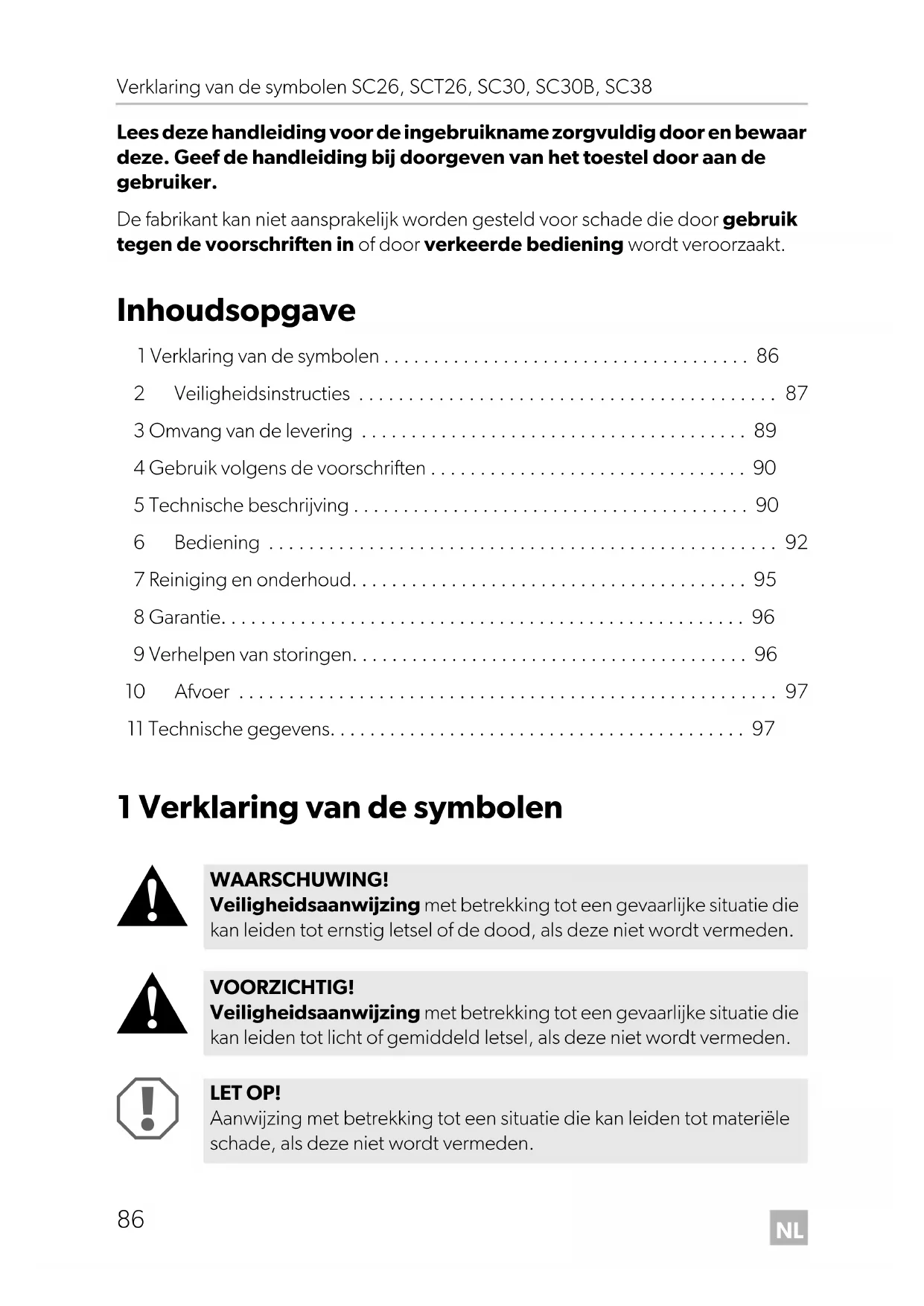 WAARSCHUWING! Veiligheidsaanwijzing met betrekking tot een gevaarlijke situatie die kan leiden tot ernstig letsel of de dood, als deze niet wordt vermeden. VOORZICHTIG! Veiligheidsaanwijzing met betrekking tot een gevaarlijke situatie die kan leiden tot licht of gemiddeld letsel, als deze niet wordt vermeden. LET OP! Aanwijzing met betrekking tot een situatie die kan leiden tot materiële schade, als deze niet wordt vermeden. SC26-SCT26-SC30-SC38_OPM_EMEA16.book Seite 86 Mittwoch, 19. Juni 2019 8:51 20NL SC26, SCT26, SC30, SC30B, SC38 Veiligheidsinstructies
