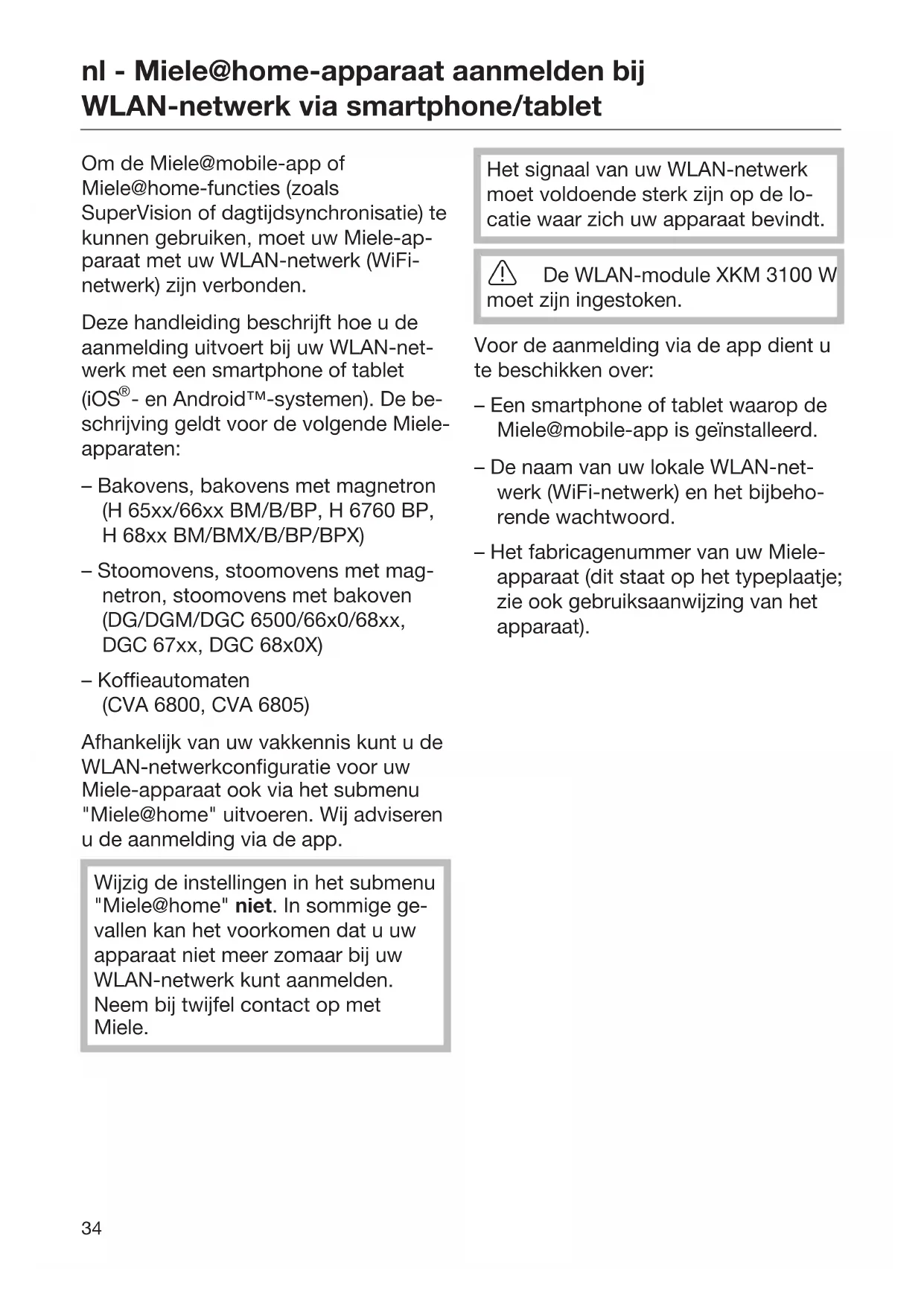 - en Android™-systemen). De be- schrijving geldt voor de volgende Miele- apparaten: – Bakovens, bakovens met magnetron (H65xx/66xxBM/B/BP, H6760BP, H68xxBM/BMX/B/BP/BPX) – Stoomovens, stoomovens met mag- netron, stoomovens met bakoven (DG/DGM/DGC6500/66x0/68xx, DGC67xx, DGC68x0X) – Koffieautomaten (CVA 6800, CVA 6805) Afhankelijk van uw vakkennis kunt u de WLAN-netwerkconfiguratie voor uw Miele-apparaat ook via het submenu "Miele@home" uitvoeren. Wij adviseren u de aanmelding via de app. Wijzig de instellingen in het submenu "Miele@home" niet. In sommige ge- vallen kan het voorkomen dat u uw apparaat niet meer zomaar bij uw WLAN-netwerk kunt aanmelden. Neem bij twijfel contact op met Miele. Het signaal van uw WLAN-netwerk moet voldoende sterk zijn op de lo- catie waar zich uw apparaat bevindt. De WLAN-module XKM 3100W moet zijn ingestoken. Voor de aanmelding via de app dient u te beschikken over: – Een smartphone of tablet waarop de Miele@mobile-app is geïnstalleerd. – De naam van uw lokale WLAN-net- werk (WiFi-netwerk) en het bijbeho- rende wachtwoord. – Het fabricagenummer van uw Miele- apparaat (dit staat op het typeplaatje; zie ook gebruiksaanwijzing van het apparaat).nl - Miele@home-apparaat aanmelden bij WLAN-netwerk via smartphone/tablet