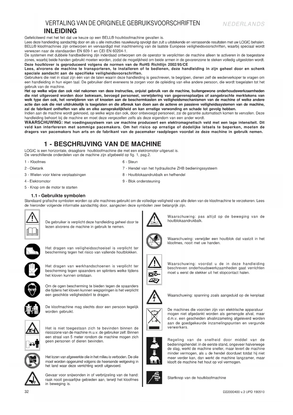 Lees deze handleiding aandachtig door en als u alle instructies nauwkeurig opvolgt dan zult uuitstekende en verrassende resultaten met uw LOGIC behalen. BELLO Kloofmachines zijn ontworpen en vervaardig met inachtning van de laatste Europese veiligheidsvoorschriften, waar bij special wordt verwezen naar de standaarden EN 609-1 en CEI EN 60204-1.