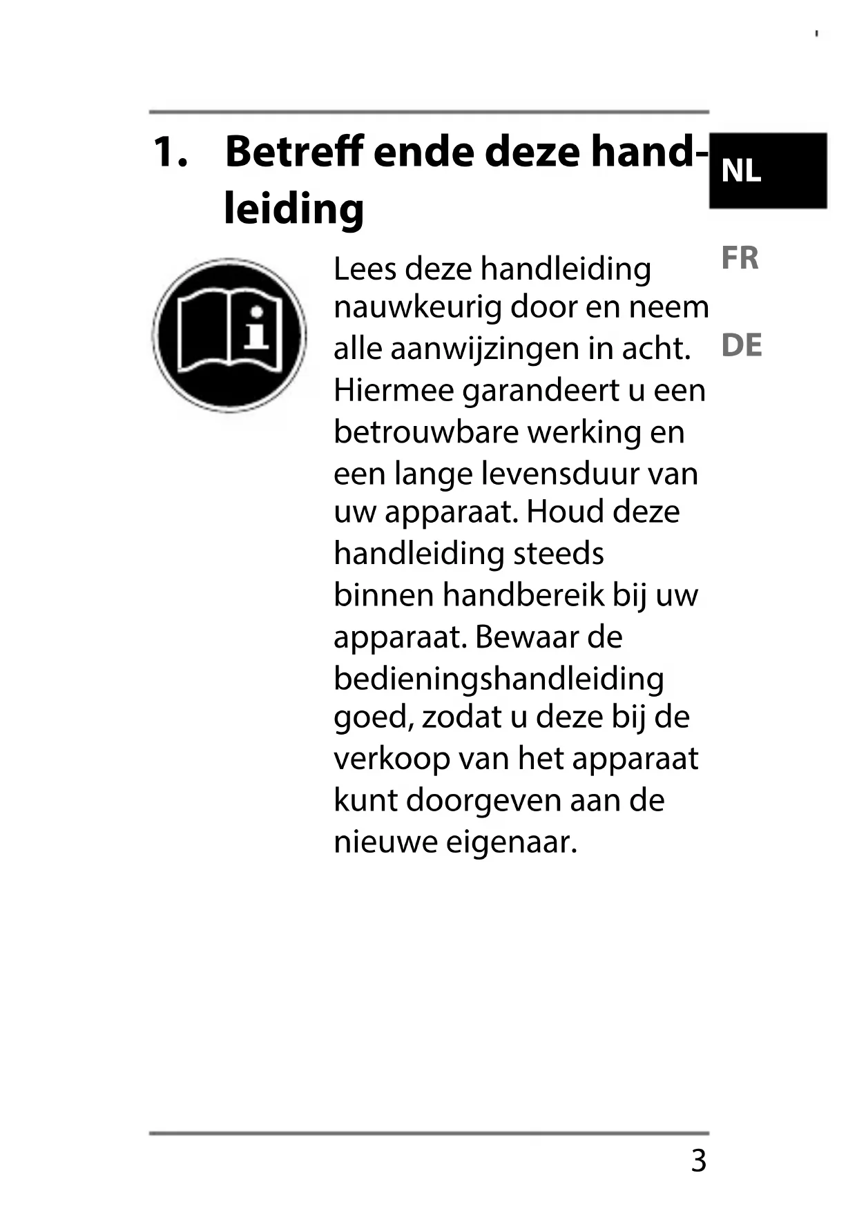 leiding Lees deze handleiding nauwkeurig door en neem alle aanwijzingen in acht. Hiermee garandeert u een betrouwbare werking en een lange levensduur van uw apparaat. Houd deze handleiding steeds binnen handbereik bij uw apparaat. Bewaar de bedieningshandleiding goed, zodat u deze bij de verkoop van het apparaat kunt doorgeven aan de nieuwe eigenaar.4 1.1. In deze handleiding gebruikte waarschu- wingspictogrammen en -symbolen GEVAAR! Waarschuwing voor acuut levensgevaar! WAARSCHUWING! Waarschuwing voor mogelijk levensgevaar en/of ernstig onom- keerbaar letsel! VOORZICHTIG! Waarschuwing voor mogelijk middelzwaar of gering letsel!5