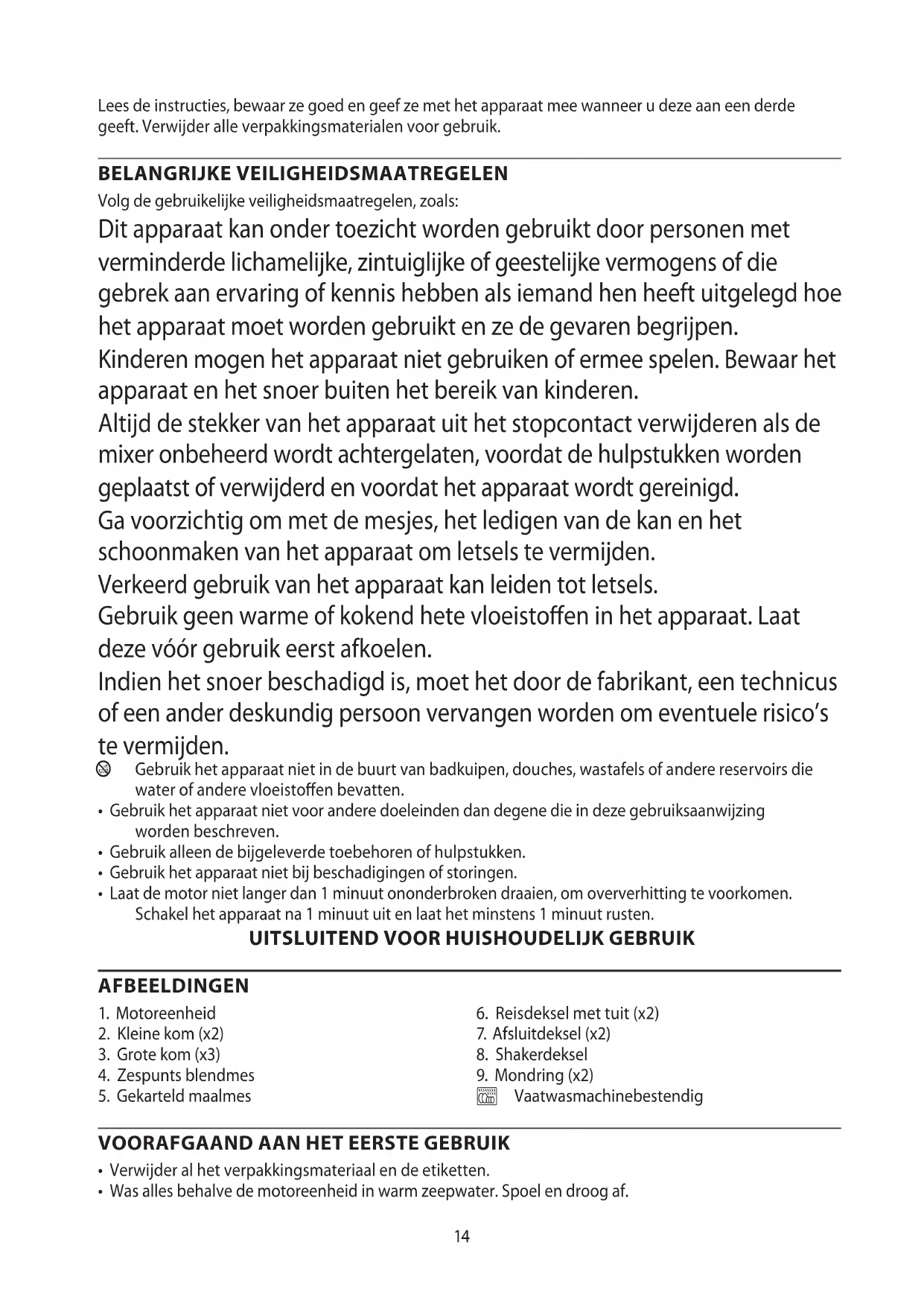 AE14 Lees de instructies, bewaar ze goed en geef ze met het apparaat mee wanneer u deze aan een derde geeft. Verwijder alle verpakkingsmaterialen voor gebruik. BELANGRIJKE VEILIGHEIDSMAATREGELEN Volg de gebruikelijke veiligheidsmaatregelen, zoals: Dit apparaat kan onder toezicht worden gebruikt door personen met verminderde lichamelijke, zintuiglijke of geestelijke vermogens of die gebrek aan ervaring of kennis hebben als iemand hen heeft uitgelegd hoe het apparaat moet worden gebruikt en ze de gevaren begrijpen. Kinderen mogen het apparaat niet gebruiken of ermee spelen. Bewaar het apparaat en het snoer buiten het bereik van kinderen. Altijd de stekker van het apparaat uit het stopcontact verwijderen als de mixer onbeheerd wordt achtergelaten, voordat de hulpstukken worden geplaatst of verwijderd en voordat het apparaat wordt gereinigd. Ga voorzichtig om met de mesjes, het ledigen van de kan en het schoonmaken van het apparaat om letsels te vermijden. Verkeerd gebruik van het apparaat kan leiden tot letsels. Gebruik geen warme of kokend hete vloeistoen in het apparaat. Laat deze vóór gebruik eerst afkoelen. Indien het snoer beschadigd is, moet het door de fabrikant, een technicus of een ander deskundig persoon vervangen worden om eventuele risico’s te vermijden. b Gebruik het apparaat niet in de buurt van badkuipen, douches, wastafels of andere reservoirs die water of andere vloeistoen bevatten.