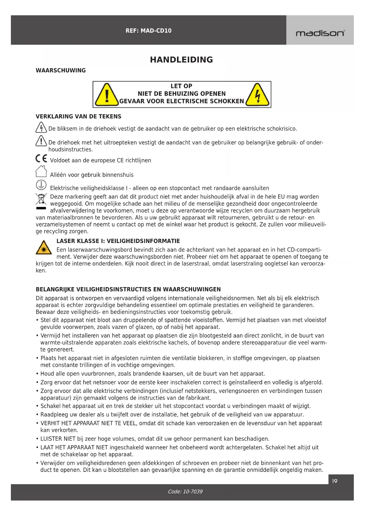 - Verwijder om veiligheidsredenen geen afdekkingen of schroeven en probeer niet de binnenkant van het pro- duct te openen. Dit kan u blootstellen aan gevaarlijke spanning en de garantie onmiddellijk ongeldig maken. REF: MAD-CD10