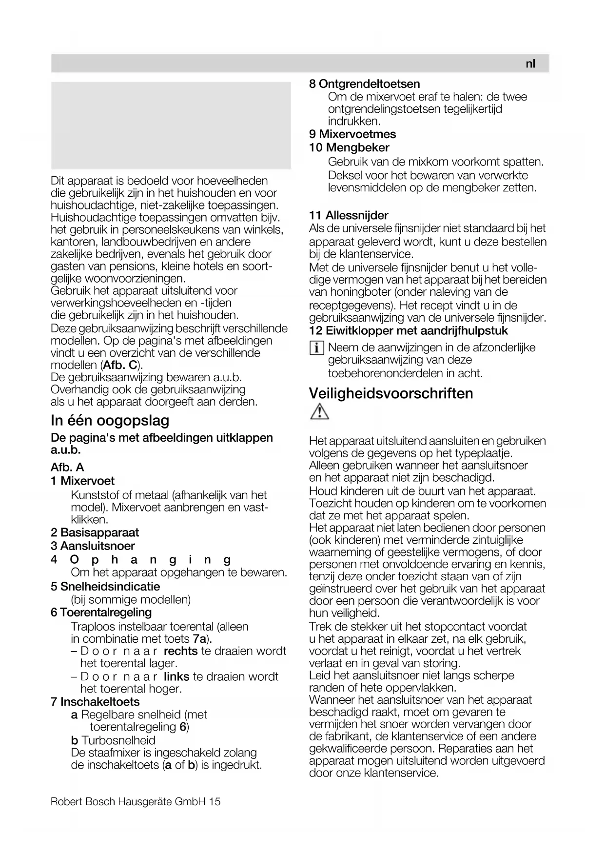 Con riserva di modifiche.Robert Bosch Hausgeräte GmbH 15 Dit apparaat is bedoeld voor hoeveelheden die gebruikelijk zijn in het huishouden en voor huishoudachtige, niet-zakelijke toepassingen. Huishoudachtige toepassingen omvatten bijv. het gebruik in personeelskeukens van winkels, kantoren, landbouwbedrijven en andere zakelijke bedrijven, evenals het gebruik door gasten van pensions, kleine hotels en soort- gelijke woonvoorzieningen. Gebruik het apparaat uitsluitend voor verwerkingshoeveelheden en -tijden die gebruikelijk zijn in het huishouden. Deze gebruiksaanwijzing beschrijft verschillende modellen. Op de pagina's met afbeeldingen vindt u een overzicht van de verschillende modellen (Afb. C). De gebruiksaanwijzing bewaren a.u.b. Overhandig ook de gebruiksaanwijzing als u het apparaat doorgeeft aan derden. In één oogopslag De pagina's met afbeeldingen uitklappen a.u.b. Afb. A 1 Mixervoet Kunststof of metaal (afhankelijk van het model). Mixervoet aanbrengen en vast- klikken. 2 Basisapparaat 3 Aansluitsnoer 4Ophanging Om het apparaat opgehangen te bewaren. 5 Snelheidsindicatie (bij sommige modellen) 6 Toerentalregeling Traploos instelbaar toerental (alleen in combinatie met toets 7a). –Door naar rechts te draaien wordt het toerental lager. –Door naar links te draaien wordt het toerental hoger. 7 Inschakeltoets a Regelbare snelheid (met toerentalregeling 6) b Turbosnelheid De staafmixer is ingeschakeld zolang de inschakeltoets (a of b) is ingedrukt. 8 Ontgrendeltoetsen Om de mixervoet eraf te halen: de twee ontgrendelingstoetsen tegelijkertijd indrukken. 9 Mixervoetmes 10 Mengbeker Gebruik van de mixkom voorkomt spatten. Deksel voor het bewaren van verwerkte levensmiddelen op de mengbeker zetten. _áà=ëçããáÖÉ=ãçÇÉääÉåW 11 Allessnijder Als de universele fijnsnijder niet standaard bij het apparaat geleverd wordt, kunt u deze bestellen bij de klantenservice. Met de universele fijnsnijder benut u het volle- dige vermogen van het apparaat bij het bereiden van honingboter (onder naleving van de receptgegevens). Het recept vindt u in de gebruiksaanwijzing van de universele fijnsnijder. 12 Eiwitklopper met aandrijfhulpstuk Neem de aanwijzingen in de afzonderlijke gebruiksaanwijzing van deze toebehorenonderdelen in acht. Veiligheidsvoorschriften sÉêïçåÇáåÖëÖÉî~~ê dÉî~~ê=î~å=ÉÉå=ÉäÉâíêáëÅÜÉ=ëÅÜçâ Het apparaat uitsluitend aansluiten en gebruiken volgens de gegevens op het typeplaatje. Alleen gebruiken wanneer het aansluitsnoer en het apparaat niet zijn beschadigd. Houd kinderen uit de buurt van het apparaat. Toezicht houden op kinderen om te voorkomen dat ze met het apparaat spelen. Het apparaat niet laten bedienen door personen (ook kinderen) met verminderde zintuiglijke waarneming of geestelijke vermogens, of door personen met onvoldoende ervaring en kennis, tenzij deze onder toezicht staan van of zijn geïnstrueerd over het gebruik van het apparaat door een persoon die verantwoordelijk is voor hun veiligheid. Trek de stekker uit het stopcontact voordat u het apparaat in elkaar zet, na elk gebruik, voordat u het reinigt, voordat u het vertrek verlaat en in geval van storing. Leid het aansluitsnoer niet langs scherpe randen of hete oppervlakken. Wanneer het aansluitsnoer van het apparaat beschadigd raakt, moet om gevaren te vermijden het snoer worden vervangen door de fabrikant, de klantenservice of een andere gekwalificeerde persoon. Reparaties aan het apparaat mogen uitsluitend worden uitgevoerd door onze klantenservice.