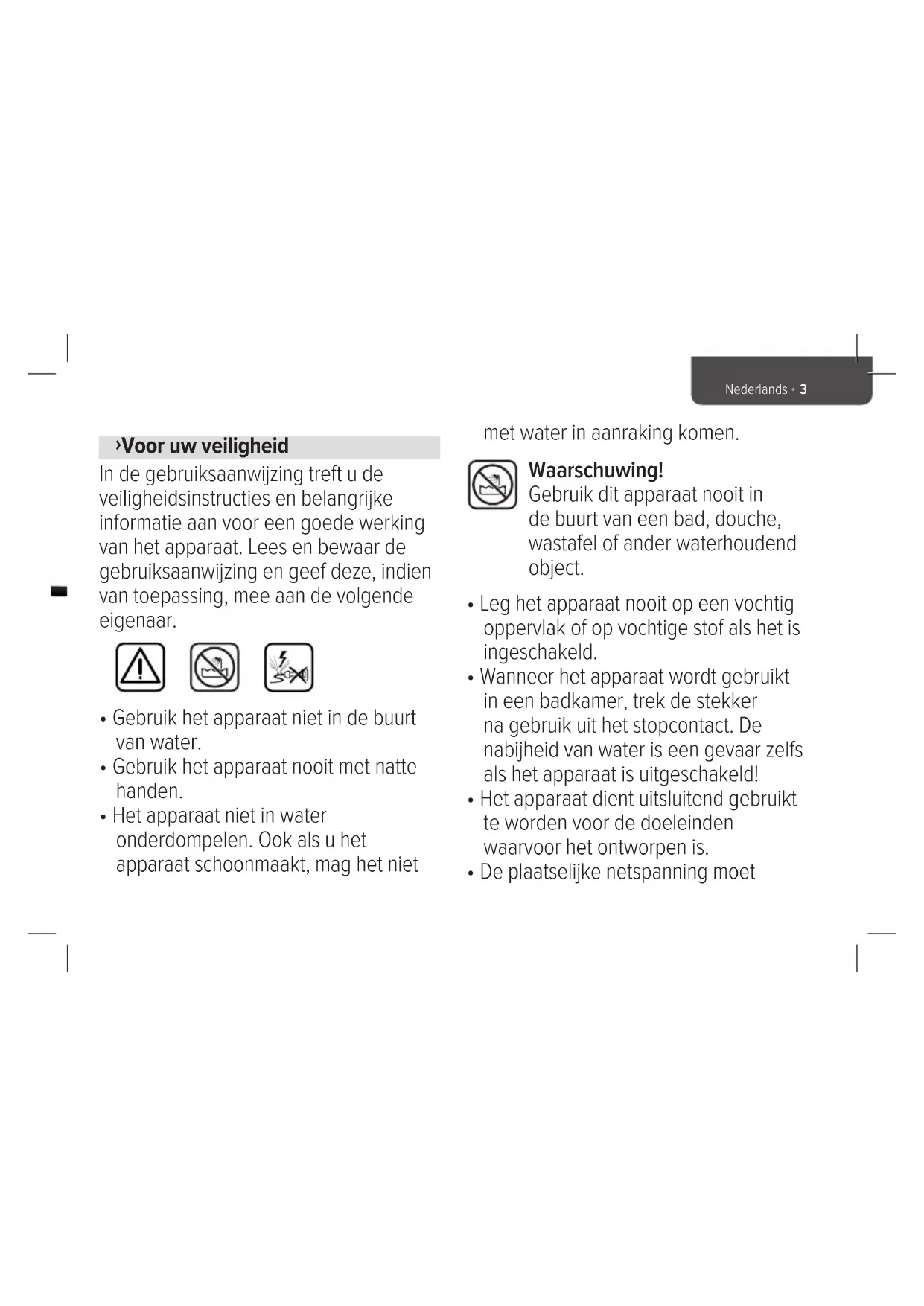 - Gebruik het apparaat Niet in de buurt van water.