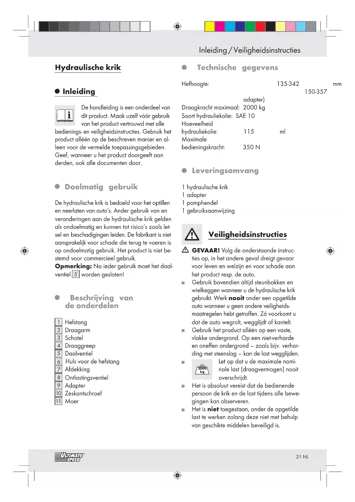 Moer Technische gegevens Hefhoogte: 135-342 mm 150-357 mm (met adapter) Draagkracht maximaal: 2000 kg Soort hydrauliekolie: SAE 10 Hoeveelheid hydrauliekolie: 115 ml Maximale bedieningskracht: 350 N Leveringsomvang 1 hydraulische krik 1 adapter 1 pomphendel 1 gebruiksaanwijzing Veiligheidsinstructies GEVAAR! Volg de onderstaande instruc- ties op, in het andere geval dreigt gevaar voor leven en welzijn en voor schade aan het product resp. de auto. Gebruik bovendien altijd steunbokken en wielkeggen wanneer u de hydraulische krik gebruikt. Werk nooit onder een opgetilde auto wanneer u geen andere veiligheids- maatregelen hebt getroffen. Zó voorkomt u dat de auto wegrolt, wegglijdt of kantelt. Gebruik het product alléén op een vaste, vlakke ondergrond. Op een niet-verharde en oneffen ondergrond – zoals bijv. verhar- ding met steenslag – kan de last wegglijden.