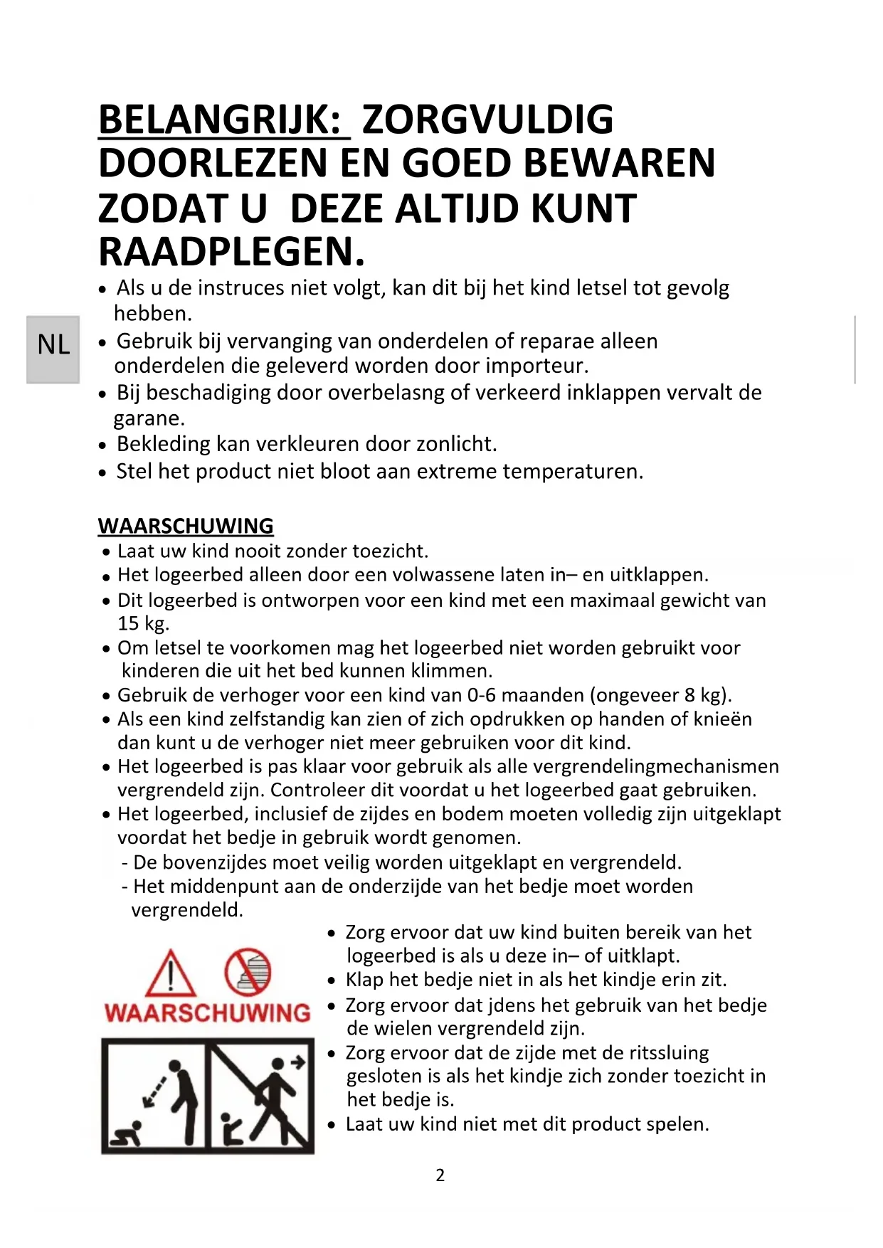 - Laat niets hinter in het bedje ofplaats het bedje Niet in de buurt van een ander product dat een möglichk gevaar zoals verskking of verwurging kanveroorzaken zoals koordjes van spelgoed of gordijn/jaloezie koordjes etc.