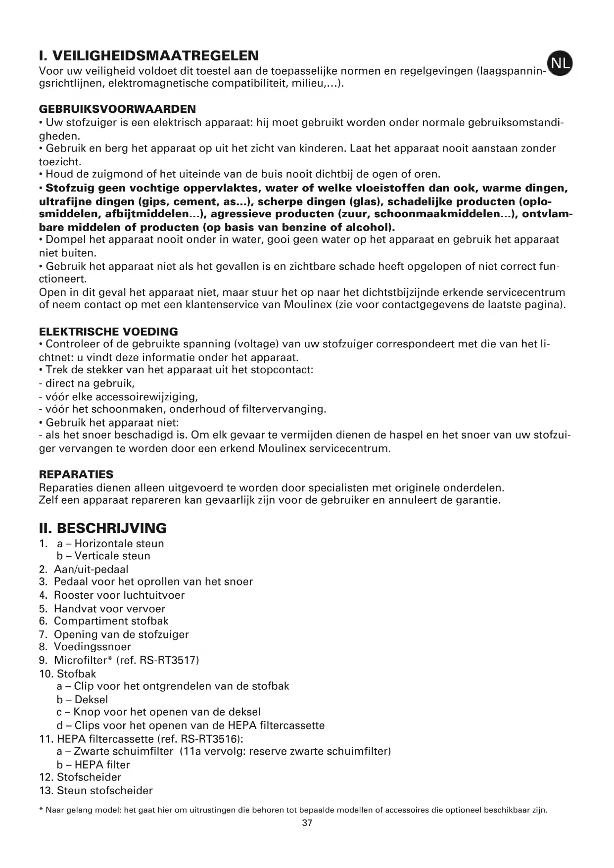 - Gebruik het apparaat niet: - als het snoer beschadigd is. Om elk gevaar te vermijden dienen de haspel en het snoer van uw stofzui- ger vervangen te worden door een erkend Moulinex servicecentrum. REPARATIES Reparaties dienen alleen uitgevoerd te worden door specialisten met originele onderdelen. Zelf een apparaat repareren kan gevaarlijk zijn voor de gebruiker en annuleert de garantie.