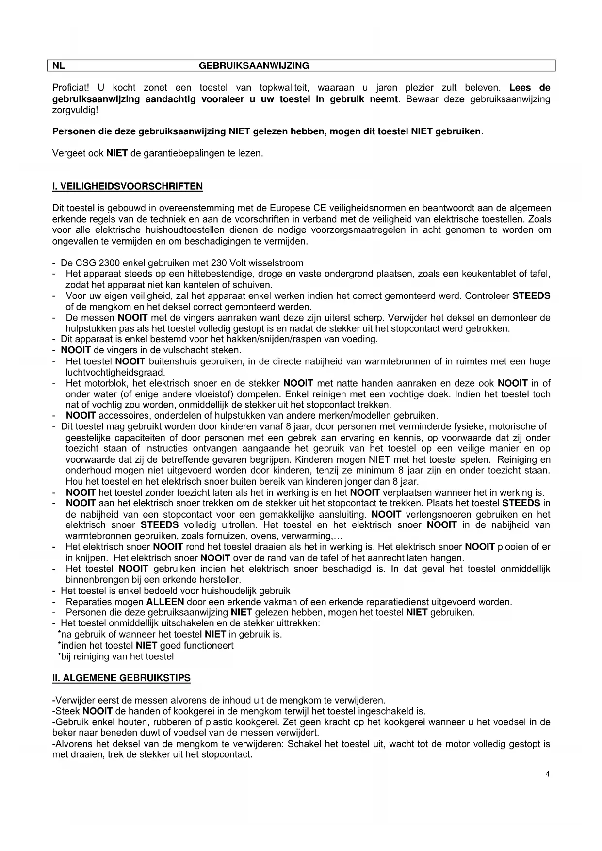 Verwijder alle verpakkingen en stickers. In de verpakking treft u de CSG 2300, 1(OPK, 1 deksel voor de chopper functie, 1 deksel met vulschacht en stamper voor de slicer-grater functie, 1 inox mes, 1 dubbelzijdige messenschijf, 1 schijfhouder en de gebruiksaanwijzing. Voordat u het toestel voor de eerste koer gebruikt, raden wij u aan om alle onderden grondig te reinigen in een zeepsopje,uitgezonderd het motorblok.Deze kan u best reinigen met een vochtige doeck. U kan het toestel enkel inschaken indien alle onderden/accessoires correct gemonteerd werden.