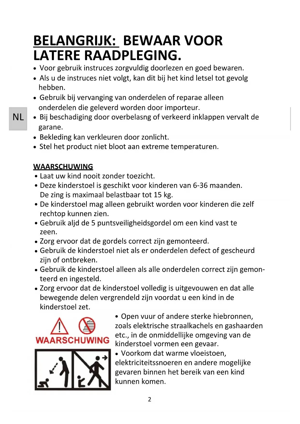 LATERE RAADPLEGING. Voor gebruik instructies zorgvuldig doorlezen en goed bewaren. Als u de instructies niet volgt, kan dit bij het kind letsel tot gevolg hebben. Gebruik bij vervanging van onderdelen of reparatie alleen onderdelen die geleverd worden door importeur. Bij beschadiging door overbelasting of verkeerd inklappen vervalt de garantie. Bekleding kan verkleuren door zonlicht. Stel het product niet bloot aan extreme temperaturen. WAARSCHUWING