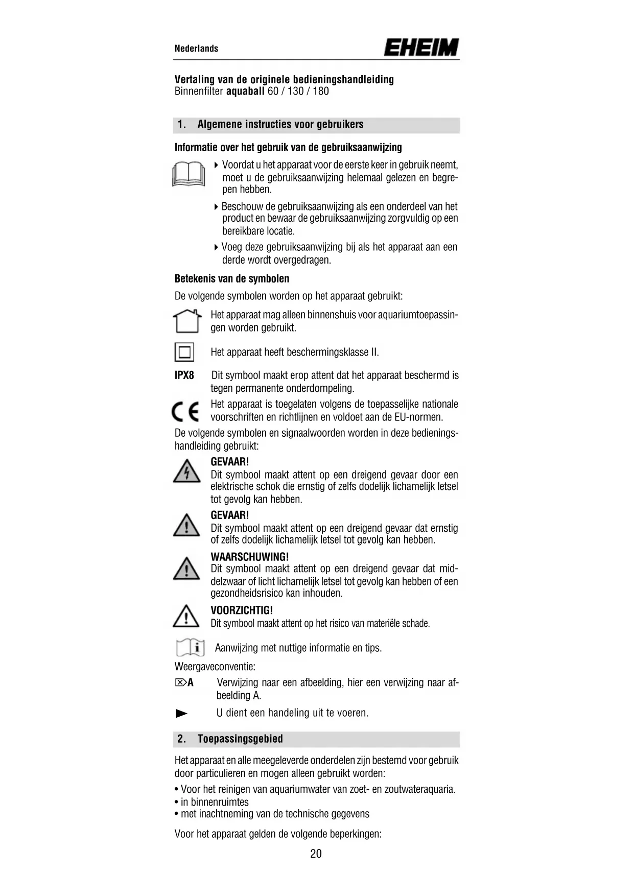 par des règlements nationaux basés sur la directive UE 2012/19/UE relative aux appareils électroniques usagés (WEEE (Déchets d’équipements électriques et électroni- ques)). Conformément à cette directive, l’appareil ne doit plus être éliminé avec les déchets communaux ou ménagers. L’- appareil peut être déposé gratuitement auprès des points de collecte ou déchetteries municipaux. L’emballage du produit est composé de matériaux recyclables. Éliminez ces matéri- aux de manière non polluante et faites-les parvenir à un point de recyclage.1. Algemene instructies voor gebruikers Informatie over het gebruik van de gebruiksaanwijzing 4Voordat u het apparaat voor de eerste keer in gebruik neemt, moet u de gebruiksaanwijzing helemaal gelezen en begre- pen hebben. 4Beschouw de gebruiksaanwijzing als een onderdeel van het product en bewaar de gebruiksaanwijzing zorgvuldig op een bereikbare locatie. 4Voeg deze gebruiksaanwijzing bij als het apparaat aan een derde wordt overgedragen. Betekenis van de symbolen De volgende symbolen worden op het apparaat gebruikt: Het apparaat mag alleen binnenshuis voor aquariumtoepassin- gen worden gebruikt. Het apparaat heeft beschermingsklasse II. IPX8 Dit symbool maakt erop attent dat het apparaat beschermd is tegen permanente onderdompeling. Het apparaat is toegelaten volgens de toepasselijke nationale voorschriften en richtlijnen en voldoet aan de EU-normen. De volgende symbolen en signaalwoorden worden in deze bedienings- handleiding gebruikt: GEVAAR! Dit symbool maakt attent op een dreigend gevaar door een elektrische schok die ernstig of zelfs dodelijk lichamelijk letsel tot gevolg kan hebben. GEVAAR! Dit symbool maakt attent op een dreigend gevaar dat ernstig of zelfs dodelijk lichamelijk letsel tot gevolg kan hebben. WAARSCHUWING! Dit symbool maakt attent op een dreigend gevaar dat mid- delzwaar of licht lichamelijk letsel tot gevolg kan hebben of een gezondheidsrisico kan inhouden. VOORZICHTIG! Dit symbool maakt attent op het risico van materiële schade. Aanwijzing met nuttige informatie en tips. Weergaveconventie: ⌦A Verwijzing naar een afbeelding, hier een verwijzing naar af- beelding A.
