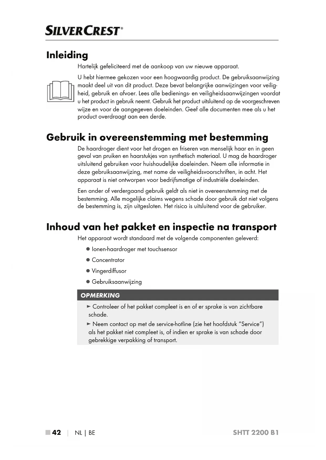 - Importeur ■ 42 │ NL│BE SHTT 2200 B1 Inleiding Hartelijk gefeliciteerd met de aankoop van uw nieuwe apparaat. U hebt hiermee gekozen voor een hoogwaardig product. De gebruiksaanwijzing maakt deel uit van dit product. Deze bevat belangrijke aanwijzingen voor veilig- heid, gebruik en afvoer. Lees alle bedienings- en veiligheidsaanwijzingen voordat u het product in gebruik neemt. Gebruik het product uitsluitend op de voorgeschreven wijze en voor de aangegeven doeleinden. Geef alle documenten mee als u het product overdraagt aan een derde. Gebruik in overeenstemming met bestemming De haardroger dient voor het drogen en friseren van menselijk haar en in geen geval van pruiken en haarstukjes van synthetisch materiaal. U mag de haardroger uitsluitend gebruiken voor huishoudelijke doeleinden. Neem alle informatie in deze gebruiksaanwijzing, met name de veiligheidsvoorschriften, in acht. Het apparaat is niet ontworpen voor bedrijfsmatige of industriële doeleinden. Een ander of verdergaand gebruik geldt als niet in overeenstemming met de bestemming. Alle mogelijke claims wegens schade door gebruik dat niet volgens de bestemming is, zijn uitgesloten. Het risico is uitsluitend voor de gebruiker. Inhoud van het pakket en inspectie na transport Het apparaat wordt standaard met de volgende componenten geleverd: ▯ Ionen-haardroger met touchsensor ▯ Concentrator ▯ Vingerdiffusor ▯ Gebruiksaanwijzing OPMERKING ► Controleer of het pakket compleet is en of er sprake is van zichtbare schade. ► Neem contact op met de service-hotline (zie het hoofdstuk “Service”) als het pakket niet compleet is, of indien er sprake is van schade door gebrekkige verpakking of transport.NL│BE │ 43 ■ SHTT 2200 B1 Apparaatbeschrijving Afbeelding A: 1 Concentrator 2 Luchtaanzuigrooster 3 Sensorveld 4 Ophangoog 5 Indicatielampje 6 Blaasstandenschakelaar (2 standen) 7 Verwarmingsstandenschakelaar (3 standen) 8 Koudeluchtknop (Cool-Shot) Afbeelding B: 9 Vingerdiffusor Technische gegevens Netspanning 220 – 240 V ∼ (wisselstroom), 50/60 Hz Nominaal vermogen 1900 – 2300 W Beschermingsklasse II / (dubbel geïsoleerd) Veiligheidsvoorschriften p. 52