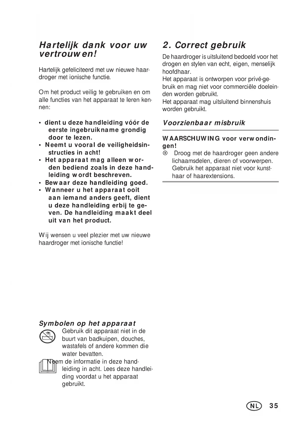 - Wanneer u het apparaat ooit aan iemand anders geeft, dient u deze handleiding erbij te ge- ven. De handleiding maakt deel uit van het product. Wij wensen u veel plezier met uw nieuwe haardroger met ionische functie! Symbolen op het apparaat Gebruik dit apparaat niet in de buurt van badkuipen, douches, wastafels of andere kommen die water bevatten. __ Neem de informatie in deze hand- leiding in acht. Lees deze handlei- ding voordat u het apparaat gebruikt.