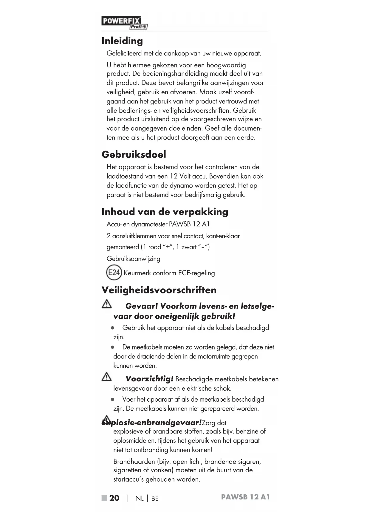 Inleiding Gefeliciteerd met de aankoop van uw nieuwe apparaat. U hebt hiermee gekozen voor een hoogwaardig product. De bedieningshandleiding maakt deel uit van dit product. Deze bevat belangrijke aanwijzingen voor veiligheid, gebruik en afvoeren. Maak uzelf vooraf- gaand aan het gebruik van het product vertrouwd met alle bedienings- en veiligheidsvoorschriften. Gebruik het product uitsluitend op de voorgeschreven wijze en voor de aangegeven doeleinden. Geef alle documen- ten mee als u het product doorgeeft aan een derde. Gebruiksdoel Het apparaat is bestemd voor het controleren van de laadtoestand van een 12 Volt accu. Bovendien kan ook de laadfunctie van de dynamo worden getest. Het ap- paraat is niet bestemd voor bedrijfsmatig gebruik. Inhoud van de verpakking Accu- en dynamotester PAWSB 12 A1 2 aansluitklemmen voor snel contact, kant-en-klaar gemonteerd (1 rood “+”, 1 zwart “–”) Gebruiksaanwijzing Keurmerk conform ECE-regeling Veiligheidsvoorschriften Gevaar! Voorkom levens- en letselge- vaar door oneigenlijk gebruik! Ɣ Gebruik het apparaat niet als de kabels beschadigd zijn. Ɣ De meetkabels moeten zo worden gelegd, dat deze niet door de draaiende delen in de motorruimte gegrepen kunnen worden. Voorzichtig! Beschadigde meetkabels betekenen levensgevaar door een elektrische schok. Ɣ Voer het apparaat af als de meetkabels beschadigd zijn. De meetkabels kunnen niet gerepareerd worden. Explosie- en brandgevaar! Zorg dat explosieve of brandbare stoffen, zoals bijv. benzine of oplosmiddelen, tijdens het gebruik van het apparaat niet tot ontbranding kunnen komen! Brandhaarden (bijv. open licht, brandende sigaren, sigaretten of vonken) moeten uit de buurt van de startaccu‘s gehouden worden.PAWSB 12 A1