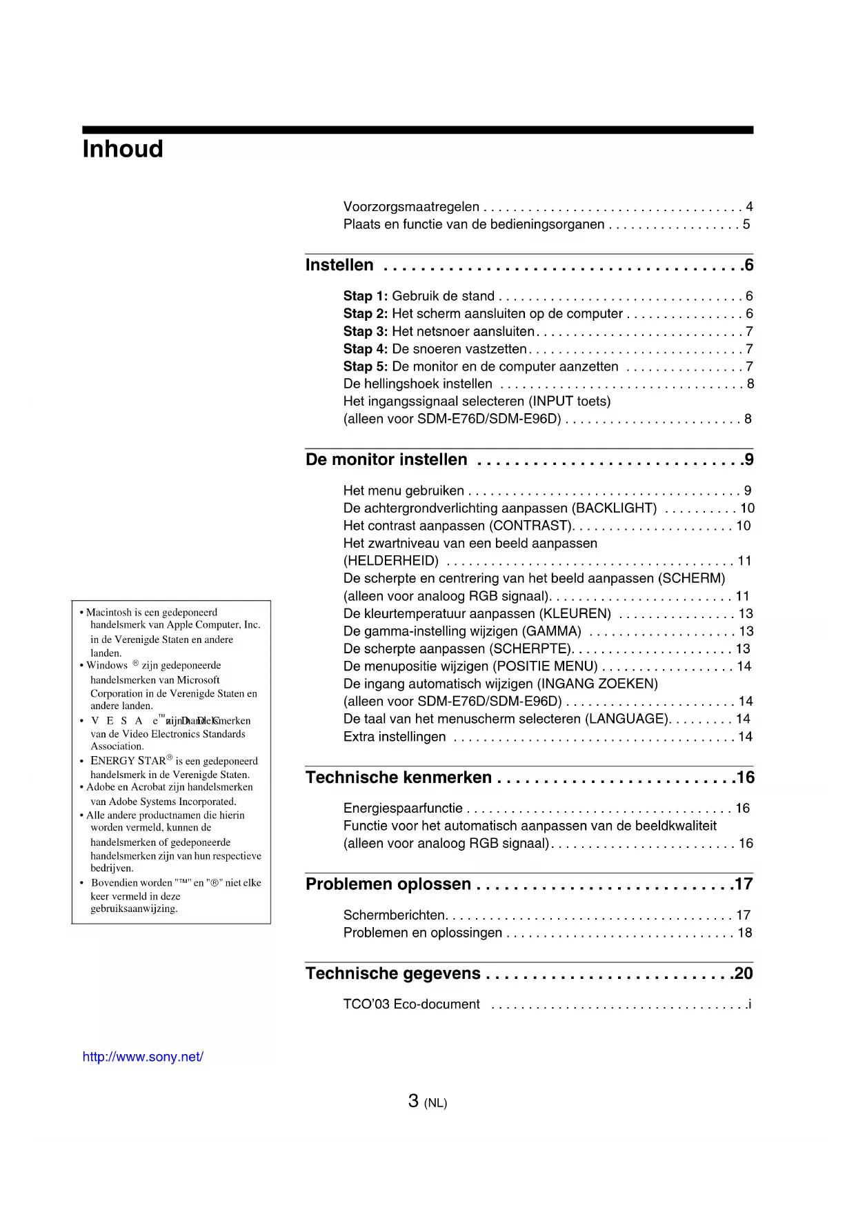 - Bovendien worden "™" en "®" niet elke keer vermeld in deze gebruiksaanwijzing. http://www.sony.net/ 3 (NL) Voorzorgsmaatregelen . . . . . . . . . . . . . . . . . . . . . . . . . . . . . . . . . . . 4 Plaats en functie van de bedieningsorganen . . . . . . . . . . . . . . . . . . 5 Instellen . . . . . . . . . . . . . . . . . . . . . . . . . . . . . . . . . . . . . . .6 Stap 1: Gebruik de stand . . . . . . . . . . . . . . . . . . . . . . . . . . . . . . . . . 6 Stap 2: Het scherm aansluiten op de computer . . . . . . . . . . . . . . . . 6 Stap 3: Het netsnoer aansluiten. . . . . . . . . . . . . . . . . . . . . . . . . . . . 7 Stap 4: De snoeren vastzetten. . . . . . . . . . . . . . . . . . . . . . . . . . . . . 7 Stap 5: De monitor en de computer aanzetten . . . . . . . . . . . . . . . . 7 De hellingshoek instellen . . . . . . . . . . . . . . . . . . . . . . . . . . . . . . . . . 8 Het ingangssignaal selecteren (INPUT toets) (alleen voor SDM-E76D/SDM-E96D) . . . . . . . . . . . . . . . . . . . . . . . . 8 De monitor instellen . . . . . . . . . . . . . . . . . . . . . . . . . . . . .9 Het menu gebruiken . . . . . . . . . . . . . . . . . . . . . . . . . . . . . . . . . . . . . 9 De achtergrondverlichting aanpassen (BACKLIGHT) . . . . . . . . . . 10 Het contrast aanpassen (CONTRAST). . . . . . . . . . . . . . . . . . . . . . 10 Het zwartniveau van een beeld aanpassen (HELDERHEID) . . . . . . . . . . . . . . . . . . . . . . . . . . . . . . . . . . . . . . . 11 De scherpte en centrering van het beeld aanpassen (SCHERM) (alleen voor analoog RGB signaal). . . . . . . . . . . . . . . . . . . . . . . . . 11 De kleurtemperatuur aanpassen (KLEUREN) . . . . . . . . . . . . . . . . 13 De gamma-instelling wijzigen (GAMMA) . . . . . . . . . . . . . . . . . . . . 13 De scherpte aanpassen (SCHERPTE). . . . . . . . . . . . . . . . . . . . . . 13 De menupositie wijzigen (POSITIE MENU) . . . . . . . . . . . . . . . . . . 14 De ingang automatisch wijzigen (INGANG ZOEKEN) (alleen voor SDM-E76D/SDM-E96D) . . . . . . . . . . . . . . . . . . . . . . . 14 De taal van het menuscherm selecteren (LANGUAGE). . . . . . . . . 14 Extra instellingen . . . . . . . . . . . . . . . . . . . . . . . . . . . . . . . . . . . . . . 14 Technische kenmerken . . . . . . . . . . . . . . . . . . . . . . . . . .16 Energiespaarfunctie . . . . . . . . . . . . . . . . . . . . . . . . . . . . . . . . . . . . 16 Functie voor het automatisch aanpassen van de beeldkwaliteit (alleen voor analoog RGB signaal). . . . . . . . . . . . . . . . . . . . . . . . . 16 Problemen oplossen . . . . . . . . . . . . . . . . . . . . . . . . . . . .17 Schermberichten. . . . . . . . . . . . . . . . . . . . . . . . . . . . . . . . . . . . . . . 17 Problemen en oplossingen . . . . . . . . . . . . . . . . . . . . . . . . . . . . . . . 18 Technische gegevens . . . . . . . . . . . . . . . . . . . . . . . . . . .20 TCO’03 Eco-document . . . . . . . . . . . . . . . . . . . . . . . . . . . . . . . . . . .i4 (NL) Voorzorgsmaatregelen Waarschuwing betreffende voedingsaansluitingen