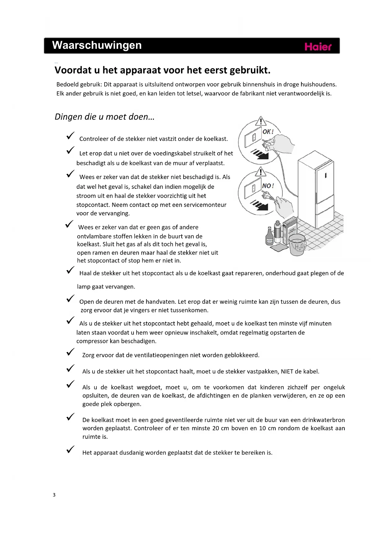 Controleerofdestekkernietvastzitonderdekoelkast. Leteropdatunietoverdevoedingskabelstruikeltofhet beschadigtalsudekoelkastvandemuurafverplaatst. Weeserzekervandatdestekkernietbeschadigdis.Als datwelhetgevalis,schakeldanindienmogelijkde stroomuitenhaaldestekkervoorzichtiguithet stopcontact.Neemcontactopmeteenservicemonteur voordevervanging. Weeserzekervandatergeen gasofandere ontvlambarestoffenlekkenindebuurtvande koelkast.Sluithetgasafalsdittochhetgevalis, openramenendeurenmaarhaaldestekkernietuit hetstopcontactofstophemernietin. Haaldestekkeruithetstopcontactalsudekoelkastgaatrepareren,onderhoudgaatplegenofde lampgaatvervangen. Opendedeurenmetdehandvaten.Leteropdaterweinigruimtekanzijntussendedeuren,dus zorgervoordatjevingerserniettussenkomen. Alsudestekkeruithetstopcontacthebtgehaald,moetudekoelkasttenminstevijfminuten latenstaanvoordatuhemweeropnieuwinschakelt,omdatregelmatigopstartende compressorkanbeschadigen. Zorgervoordatdeventilatieopeningennietwordengeblokkeerd. Alsudestekkeruithetstopcontacthaalt,moetudestekkervastpakken,NIETdekabel. Als u de koelkast wegdoet, moet u, om te voorkomen dat kinderen zichzelf per ongeluk opsluiten,dedeurenvandekoelkast,deafdichtingenendeplankenverwijderen,enzeopeen goedeplekopbergen. Dekoelkastmoetineengoedgeventileerderuimtenietveruitdebuurvaneendrinkwaterbron wordengeplaatst.Controleerofertenminste20cmbovenen10cmrondomdekoel kastaan ruimteis. Hetapparaatdusdanigwordengeplaatstdatdestekkertebereikenis. 4 Waarschuwingen