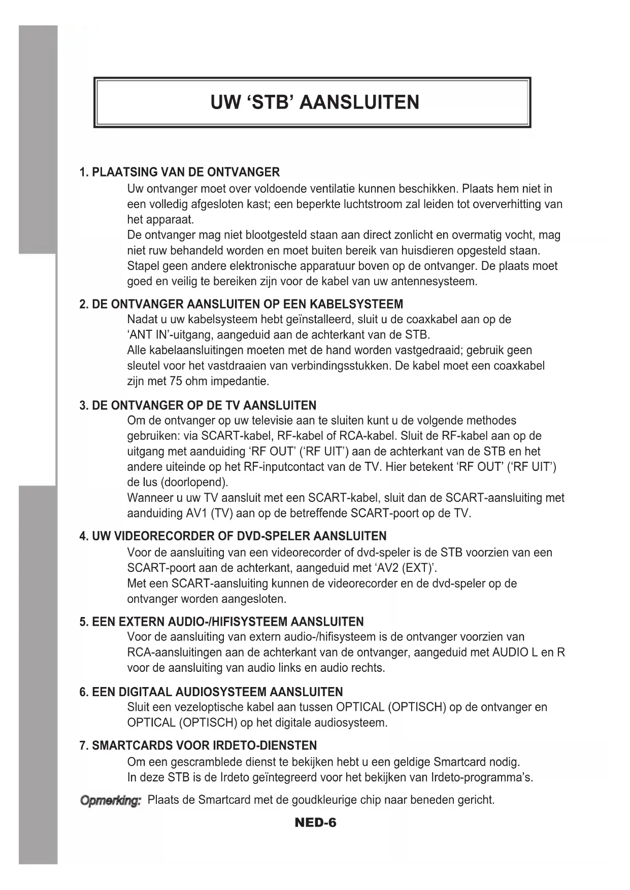 Sluit alle onderdelen aan voordat u de stekkers in het stopcontact steekt. Schakel de STB, TV en andere onderdelen altijd eerst uit, voordat u kabel aansluit of loskoppelt. Voordat u deze STB loskoppelt van de hoofdstroomtoevoer, moet de stekker uit het stopcontact van de hoofdstroomtoevoer verwijderd zijn; daardoor zal de stekker van de hoofdstroomtoevoer direct bruikbaar zijn.