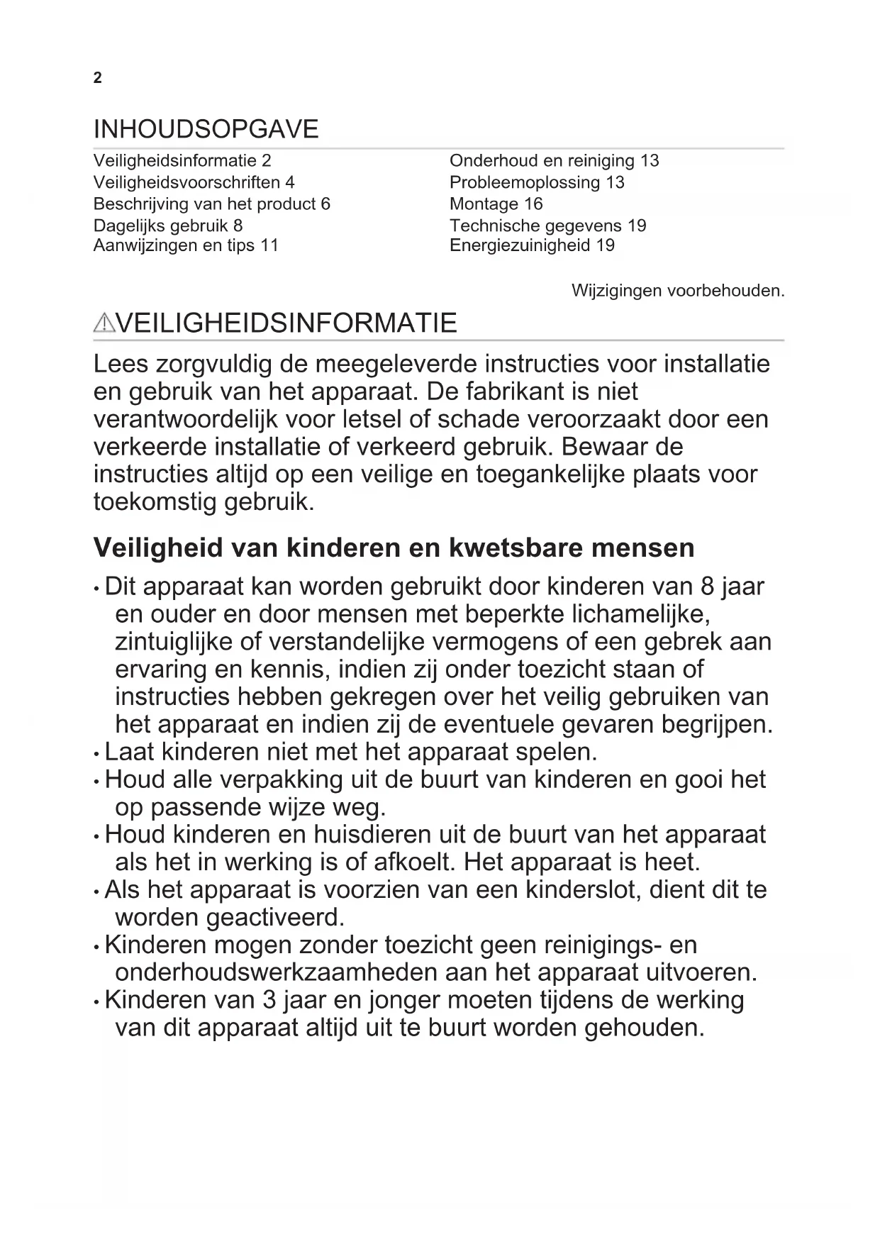 - Gebruik de restwarmte om het eten warm te houden of te smelten. 19MILIEUBESCHERMING Recycle de materialen met het symbool . Gooi de verpakking in een geschikte verzamelcontainer om het te recyclen. Help om het milieu en de volksgezondheid te beschermen en recycle het afval van elektrische en elektronische apparaten. Gooi apparaten gemarkeerd met het symbool niet weg met het huishoudelijk afval. Breng het product naar het milieustation bij u in de buurt of neem contact op met de gemeente. 20CONTENTS Safety information 21 Safety instructions 22 Product description 25 Daily use 26 Hints and tips 29 Care and cleaning 30 Troubleshooting 31 Installation 34 Technical data 37 Energy efficiency 37 Subject to change without notice. SAFETY INFORMATION Before the installation and use of the appliance, carefully read the supplied instructions. The manufacturer is not responsible for any injuries or damages that are the result of incorrect installation or usage. Always keep the instructions in a safe and accessible location for future reference. Children and vulnerable people safety