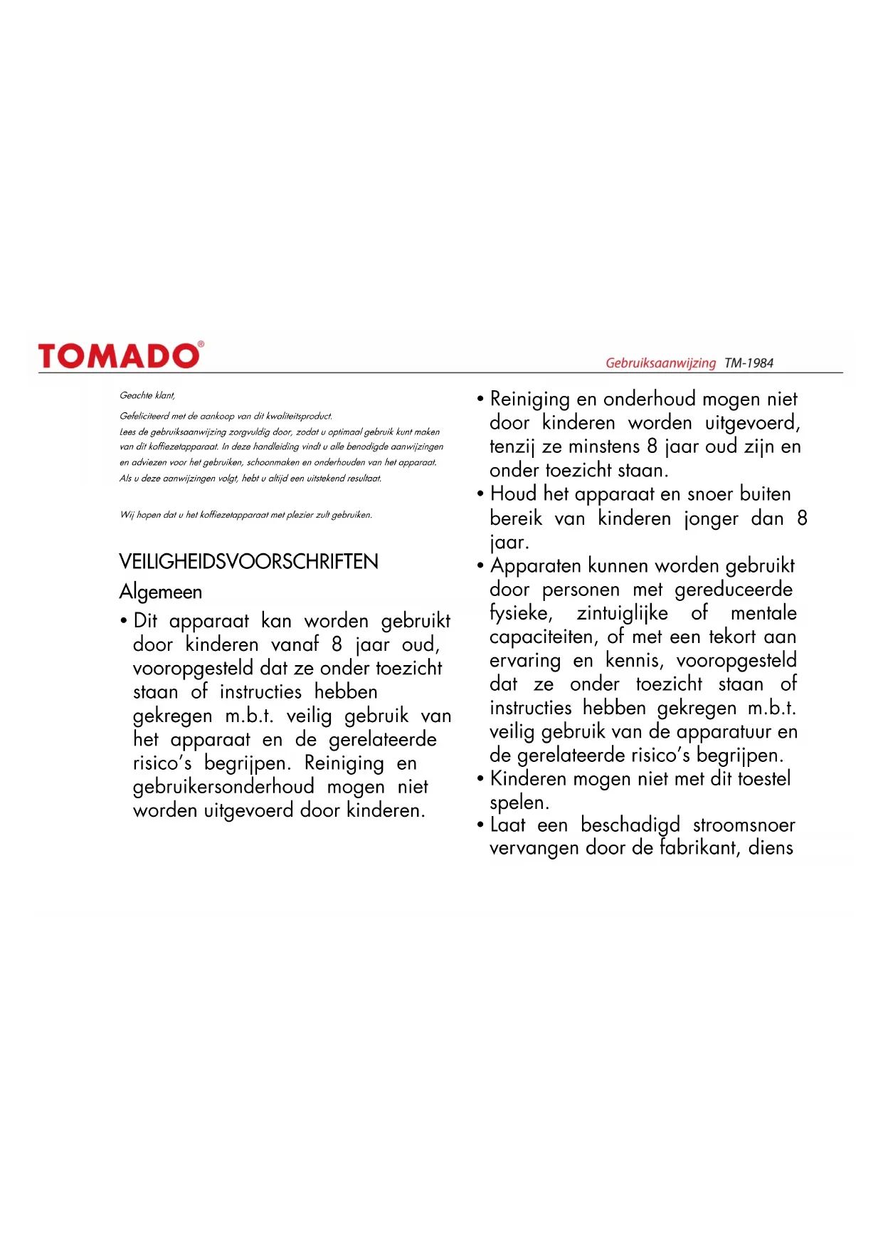 EERSTE GEBRUIK Verwijder alle verpakkingen van het apparaat. Reinig het apparaat, zie de sectie ‘Reiniging en onderhoud’. Zet het koffiezetapparaat voor de eerste keer aan met een vol waterreservoir zonder koffie volgens de procedure in de sectie ‘Gebruik’, om het apparaat te reinigen. Zet het apparaat uit met de aan/uitschakelaar. Gooi het water in de kan weg. Laat het apparaat een paar minuten afkoelen. Ga verder met de procedure in de sectie ‘Gebruik’. GEBRUIK Vul de kan met water. Giet het water uit de kan in het waterreservoir. Op de waterniveau-indicatie kunt u zien hoeveel water er nodig is om het gewenste aantal kopjes koffie te zetten. Het waterniveau mag niet boven de aanduiding ‘max’ komen. Sluit het deksel. LET OP Als u per ongeluk te veel water in het reservoir doet, dan stort deze over aan de achterkant. Zorg ervoor dat het apparaat, de stekker, het snoer en de ondergrond goed droog zijn voordat u het apparaat gebruikt. Plaats een commercieel verkrijgbaar filter in de filterhouder en gebruik de maatschep om de juiste hoeveelheid gemalen koffie toe te voegen, in overeenstemming met het aantal kopjes dat u wilt zetten. De filterhouder moet goed gesloten worden, anders kan het zijn dat het doorloop-buisje niet opent. Sluit het reservoirdeksel en start het koffiezetten door op de AAN/UIT-knop te drukken. Als u het apparaat aan laat staan, houdt deze plaat de koffie warm na het zetten. Het hele bedrijfsproces duurt 40 minuten. Na 40 minuten schakelt het apparaat vanzelf uit. U kunt de schakelaar weer handmatig aanzetten om het apparaat weer in te schakelen.REINIGING EN ONDERHOUD WAARSCHUWING: Alvorens het apparaat te reinigen, schakel het altijd uit, koppel het los van de elektriciteitstoevoer en laat het volledig afkoelen. Reinigen Gebruik voor het schoonmaken geen agressief schoonmaakmiddel, schuurmiddel of een scherp object, zoals een harde borstel of mes. Verwijder de koffiedrab uit het filter. Reinig de buitenkant van het apparaat met een vochtige doek. Droog de buitenzijde na met een droge doek. Was de koffiekan, het filter en het zwenkfilter in heet water met een beetje afwasmiddel af. Droog deze onderdelen goed af. Ontkalk het apparaat regelmatig. Afhankelijk van de hardheid van het water zal zich kalk aan de binnenzijde van het apparaat vastzetten. Hoe harder het water is dat u gebruikt, hoe vaker u het apparaat dient te ontkalken. Ontkalken Gebruik een ontkalkingsmiddel dat geschikt is voor huishoudelijke apparaten, zoals koffiezetapparaten. Gebruik het middel volgens de aanwijzingen op de verpakking. Zet het koffiezetapparaat na het ontkalken enige malen met een vol waterreservoir en zonder gemalen koffie aan, volgens de procedure in de sectie ‘Gebruik’. Hiermee worden achtergebleven kalkresten en resten van het ontkalkingsmiddel verwijderd. TECHNISCHE GEGEVENS Type nr: TM-1984 Vermogen: 600W Netspanning: 230V~50Hz Afmetingen: Product afmetingen: 190 x 155 x 250 mm Netto gewicht: 0.87 kg• TOMADO kan niet aansprakelijk gesteld worden voor materiele schade of persoonlijke ongelukken ten gevolge van aansluiting in strijd met de ter plaatse geldende veiligheidsvoorschriften en technische normen (bijvoorbeeld een ondeugdelijk stopcontact). De garantie geeft in geen enkel geval recht op schadevergoeding.