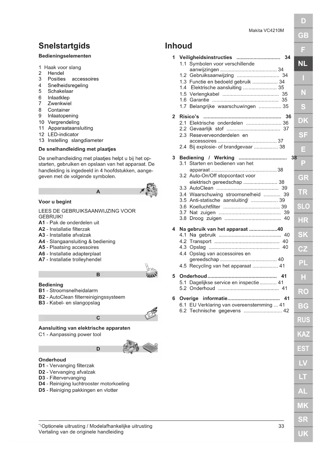 Onderhoud D1 - Vervanging filterzak D2 - Vervanging afvalzak D3 - Filtervervanging D4 - Reiniging luchtrooster motorkoeling D5 - Reiniging pakkingen en vlotter Inhoud 1 Veiligheidsinstructies ............................... 34