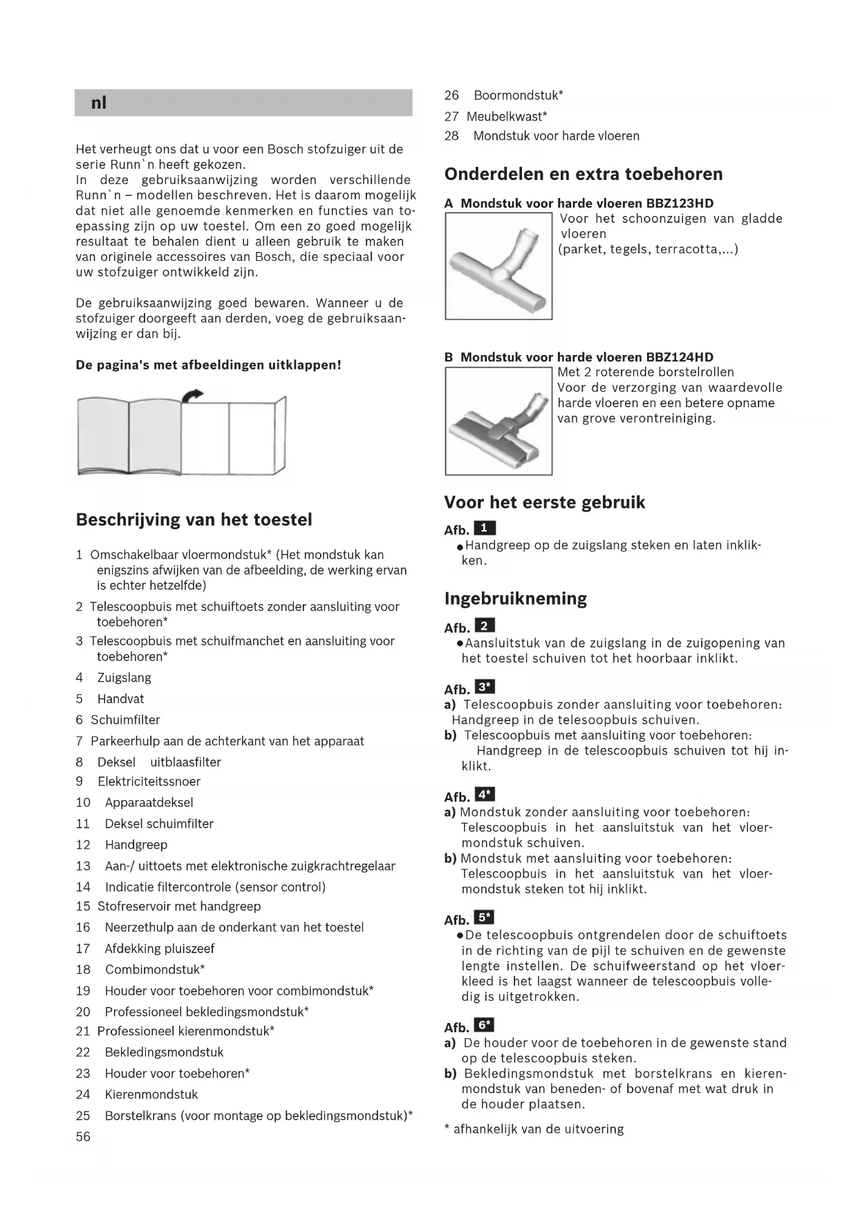 Attenzione: Non utilizzare strumenti abrasivi né detergen- ti universali o per vetro. Non immergere mai l’aspirapolvere nell’acqua. Con riserva di modifiche tecniche.56 Het verheugt ons dat u voor een Bosch stofzuiger uit de serie Runn`n heeft gekozen. In deze gebruiksaanwijzing worden verschillende Runn`n – modellen beschreven. Het is daarom mogelijk dat niet alle genoemde kenmerken en functies van to- epassing zijn op uw toestel. Om een zo goed mogelijk resultaat te behalen dient u alleen gebruik te maken van originele accessoires van Bosch, die speciaal voor uw stofzuiger ontwikkeld zijn. De gebruiksaanwijzing goed bewaren. Wanneer u de stofzuiger doorgeeft aan derden, voeg de gebruiksaan- wijzing er dan bij. De pagina's met afbeeldingen uitklappen! Beschrijving van het toestel 1 Omschakelbaar vloermondstuk* (Het mondstuk kan enigszins afwijken van de afbeelding, de werking ervan is echter hetzelfde) 2 Telescoopbuis met schuiftoets zonder aansluiting voor toebehoren* 3 Telescoopbuis met schuifmanchet en aansluiting voor toebehoren* 4 Zuigslang 5 Handvat 6 Schuimfilter 7 Parkeerhulp aan de achterkant van het apparaat 8 Deksel uitblaasfilter 9 Elektriciteitssnoer 10 Apparaatdeksel 11 Deksel schuimfilter 12 Handgreep 13 Aan-/ uittoets met elektronische zuigkrachtregelaar 14 Indicatie filtercontrole (sensor control) 15 Stofreservoir met handgreep 16 Neerzethulp aan de onderkant van het toestel 17 Afdekking pluiszeef 18 Combimondstuk* 19 Houder voor toebehoren voor combimondstuk* 20 Professioneel bekledingsmondstuk* 21 Professioneel kierenmondstuk* 22 Bekledingsmondstuk 23 Houder voor toebehoren* 24 Kierenmondstuk 25 Borstelkrans (voor montage op bekledingsmondstuk)* 26 Boormondstuk* 27 Meubelkwast* 28 Mondstuk voor harde vloeren Onderdelen en extra toebehoren A Mondstuk voor harde vloeren BBZ123HD Voor het schoonzuigen van gladde vloeren (parket, tegels, terracotta,...) B Mondstuk voor harde vloeren BBZ124HD Met 2 roterende borstelrollen Voor de verzorging van waardevolle harde vloeren en een betere opname van grove verontreiniging. Voor het eerste gebruik Afb.