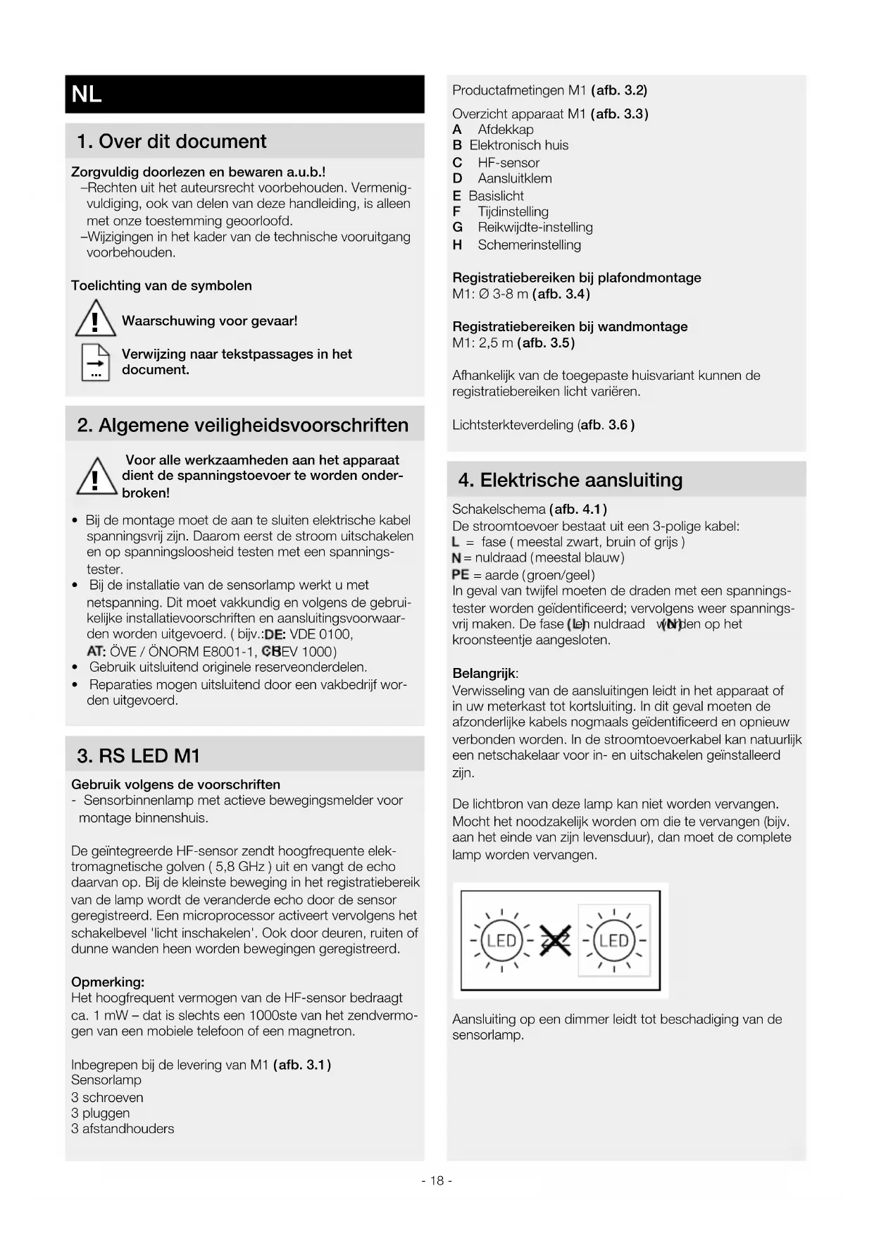 Gebruik volgens de voorschriften - Sensorbinnenlamp met actieve bewegingsmelder voor montage binnenshuis. De geïntegreerde HF-sensor zendt hoogfrequente elek- tromagnetische golven ( 5,8 GHz ) uit en vangt de echo daarvan op. Bij de kleinste beweging in het registratiebereik van de lamp wordt de veranderde echo door de sensor geregistreerd. Een microprocessor activeert vervolgens het schakelbevel 'licht inschakelen'. Ook door deuren, ruiten of dunne wanden heen worden bewegingen geregistreerd. Opmerking: Het hoogfrequent vermogen van de HF-sensor bedraagt ca. 1 mW – dat is slechts een 1000ste van het zendvermo- gen van een mobiele telefoon of een magnetron. Inbegrepen bij de levering van M1 ( afb.3.1 ) Sensorlamp 3 schroeven 3 pluggen 3 afstandhouders !- 19 -