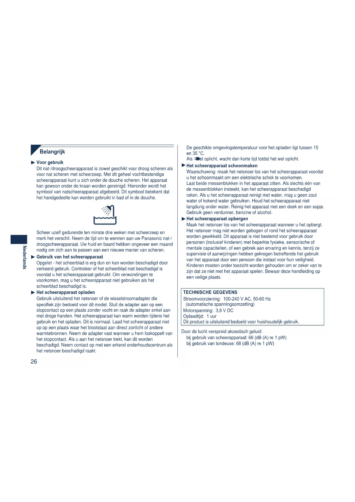 Per la salvaguardia dell’ambiente e il riciclo dei materiali Questo rasoio contiene una batteria agli ioni di litio. Assicurarsi che la batteria venga smaltita presso un centro autorizzato, se presente nel proprio Paese di residenza. Informazioni per gli utenti sullo smaltimento di apparecchiature elettriche ed elettroniche obsolete (per i nuclei familiari privati) Questo simbolo sui prodotti e/o sulla documentazione di accompagnamento signica che i prodotti elettrici ed elettronici usati non devono essere mescolati con i riuti domestici generici. Per un corretto trattamento, recupero e riciclaggio, portare questi prodotti ai punti di raccolta designati, dove verranno accettati gratuitamente. In alternativa, in alcune nazioni potrebbe essere possibile restituire i prodotti al rivenditore locale, al momento dell’acquisto di un nuovo prodotto equivalente. Uno smaltimento corretto di questo prodotto contribuirà a far risparmiare preziose risorse ed evitare potenziali effetti negativi sulla salute umana e sull’ambiente, che potrebbero derivare, altrimenti, da uno smaltimento inappropriato. Per ulteriori dettagli, contattare la propria autorità locale o il punto di raccolta designato più vicino. In caso di smaltimento errato di questo materiale di scarto, potrebbero venire applicate delle penali, in base alle leggi nazionali. Per gli utenti aziendali nell’Unione Europea Qualora si desideri smaltire apparecchiature elettriche ed elettroniche, contattare il rivenditore o il fornitore per ulteriori informazioni. Informazioni sullo smaltimento in nazioni al di fuori dell’Unione Europea Questo simbolo è valido solo nell’Unione Europea. Qualora si desideri smaltire questo prodotto, contattare le autorità locali o il rivenditore e chiedere informazioni sul metodo corretto di smaltimento.26 Nederlands Belangrijk Voor gebruik Dit nat-/droogscheerapparaat is zowel geschikt voor droog scheren als voor nat scheren met scheerzeep. Met dit geheel vochtbestendige scheerapparaat kunt u zich onder de douche scheren. Het apparaat kan gewoon onder de kraan worden gereinigd. Hieronder wordt het symbool van natscheerapparaat afgebeeld. Dit symbool betekent dat het handgedeelte kan worden gebruikt in bad of in de douche. Scheer uzelf gedurende ten minste drie weken met scheerzeep en merk het verschil. Neem de tijd om te wennen aan uw Panasonic nat-/ droogscheerapparaat. Uw huid en baard hebben ongeveer een maand nodig om zich aan te passen aan een nieuwe manier van scheren. Gebruik van het scheerapparaat Opgelet - het scheerblad is erg dun en kan worden beschadigd door verkeerd gebruik. Controleer of het scheerblad niet beschadigd is voordat u het scheerapparaat gebruikt. Om verwondingen te voorkomen, mag u het scheerapparaat niet gebruiken als het scheerblad beschadigd is. Het scheerapparaat opladen Gebruik uitsluitend het netsnoer of de wisselstroomadapter die speciek zijn bedoeld voor dit model. Sluit de adapter aan op een stopcontact op een plaats zonder vocht en raak de adapter enkel aan met droge handen. Het scheerapparaat kan warm worden tijdens het gebruik en het opladen. Dit is normaal. Laad het scheerapparaat niet op op een plaats waar het blootstaat aan direct zonlicht of andere warmtebronnen. Neem de adapter vast wanneer u hem loskoppelt van het stopcontact. Als u aan het netsnoer trekt, kan dit worden beschadigd. Neem contact op met een erkend onderhoudscentrum als het netsnoer beschadigd raakt.