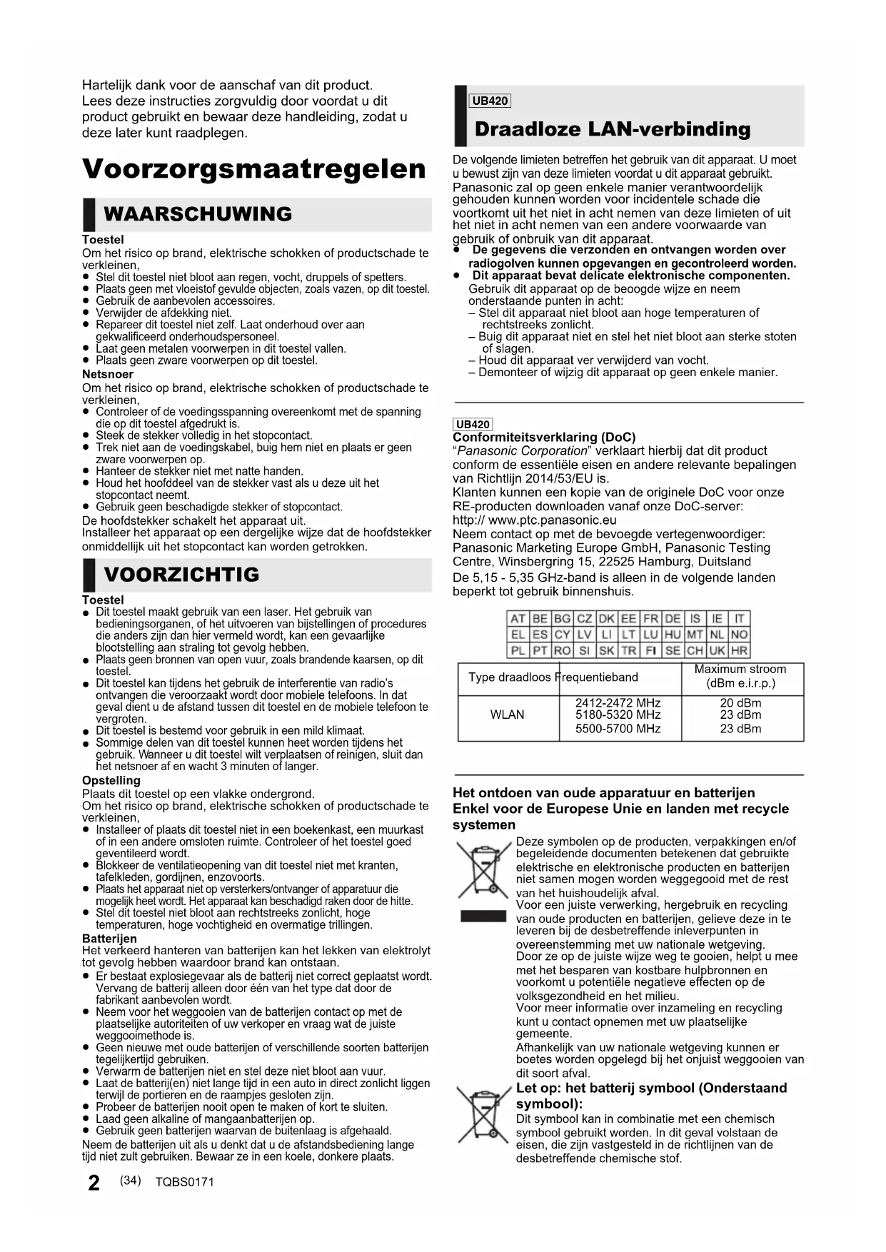 una marca comercial de Verance Corporation. Protegida por la patente 7,369,677 de EE.UU. y por otras patentes internacionales emitidas y pendientes con la licencia de Verance Corporation. Todos los derechos reservados. Este producto incorpora el siguiente software: (1) el software desarrollado independientemente por o para Panasonic Corporation, (2) el software propiedad de tercero y con licencia para Panasonic Corporation, (3) el software con licencia bajo GNU General Public License, Version 2.0 (GPL V2.0), (4) el software con licencia bajo GNU LESSER General Public License, Version 2.1 (LGPL V2.1), y/o (5) el software de fuente abierta que no es el software con licencia bajo GPL V2.0 y/o LGPL V2.1. El software categorizado como (3) - (5) se distribuye esperando que sea útil, pero SIN NINGUNA GARANTÍA, incluso sin la garantía implícita de COMERCIABILIDAD o APTITUD PARA CUALQUIER FIN PARTICULAR. Consulte los términos y condiciones detallados del presente en el menú Ajustes Reproductor. Al menos durante tres (3) años desde la entrega de este producto, Panasonic le dará a cualquier tercero que se comunique con nosotros a la información proporcionada abajo, por un costo no mayor a nuestro costo para realizar físicamente la distribución del código fuente, una copia completa que se puede leer con una máquina del correspondiente código fuente cubierto bajo GPL V2.0, LGPL V2.1 o las otras licencias con la obligación de hacerlo y también la respectiva notificación de copyright del presente. Información de contacto: oss-cd-request@gg.jp.panasonic.com El código fuente y la notificación de copyright también están disponibles sin cargo en nuestro sitio web que se menciona a continuación. https://panasonic.net/cns/oss/ (1) MS/WMA Este producto está protegido por ciertos derechos de propiedad intelectual pertenecientes a Microsoft Corporation y a terceros. El uso o la distribución de tal tecnología fuera de este producto están prohibidos si no se cuenta con una licencia de Microsoft o de una subsidiaria de Microsoft y terceros. (2) MS/PlayReady/Etiquetado del producto final Este producto contiene tecnología sujeta a ciertos derechos de propiedad intelectual de Microsoft. El uso o distribución de esta tecnología fuera de este producto está prohibido sin la licencia adecuada de Microsoft. (3) MS/PlayReady/Avisos del usuario final Los propietarios de contenido usan la tecnología de acceso de contenido Microsoft PlayReady™ para proteger su propiedad intelectual, inclusive el contenido con derecho de autor. Este dispositivo utiliza la tecnología PlayReady para acceder al contenido protegido por PlayReady y/o al contenido protegido por WMDRM. Si el dispositivo no aplica correctamente las restricciones sobre el uso del contenido, los propietarios del contenido pueden requerir que Microsoft revoque la capacidad del dispositivo de consumir el contenido protegido por PlayReady. La revocación no debe afectar el contenido no protegido o el contenido protegido por otras tecnologías de acceso al contenido. Los propietarios del contenido pueden solicitarle que actualice PlayReady para acceder a su contenido. Si se niega a actualizar, no podrá acceder al contenido que necesita ser actualizado. (4) Vorbis, FLAC, [UB420] WPA Supplicant Las licencias del software se visualizan cuando se selecciona “Licencia de Software” en el menú Configuración.* *[HOME] > “Configuración” > “Ajustes Reproductor” > “Sistema” > “Información del Sistema” (33) TQBS0171-Safety_spa.fm 9 ページ 2018年2月26日 月曜日 午後5時16分2 TQBS0171 Hartelijk dank voor de aanschaf van dit product. Lees deze instructies zorgvuldig door voordat u dit product gebruikt en bewaar deze handleiding, zodat u deze later kunt raadplegen. Voorzorgsmaatregelen ToestelOm het risico op brand, elektrische schokken of productschade te verkleinen, Stel dit toestel niet bloot aan regen, vocht, druppels of spetters. Plaats geen met vloeistof gevulde objecten, zoals vazen, op dit toestel. Gebruik de aanbevolen accessoires. Verwijder de afdekking niet. Repareer dit toestel niet zelf. Laat onderhoud over aan gekwalificeerd onderhoudspersoneel. Laat geen metalen voorwerpen in dit toestel vallen. Plaats geen zware voorwerpen op dit toestel.NetsnoerOm het risico op brand, elektrische schokken of productschade te verkleinen, Controleer of de voedingsspanning overeenkomt met de spanning die op dit toestel afgedrukt is. Steek de stekker volledig in het stopcontact. Trek niet aan de voedingskabel, buig hem niet en plaats er geen zware voorwerpen op. Hanteer de stekker niet met natte handen. Houd het hoofddeel van de stekker vast als u deze uit het stopcontact neemt. Gebruik geen beschadigde stekker of stopcontact.De hoofdstekker schakelt het apparaat uit.Installeer het apparaat op een dergelijke wijze dat de hoofdstekker onmiddellijk uit het stopcontact kan worden getrokken.Toestel Dit toestel maakt gebruik van een laser. Het gebruik van bedieningsorganen, of het uitvoeren van bijstellingen of procedures die anders zijn dan hier vermeld wordt, kan een gevaarlijke blootstelling aan straling tot gevolg hebben. Plaats geen bronnen van open vuur, zoals brandende kaarsen, op dit toestel. Dit toestel kan tijdens het gebruik de interferentie van radio’s ontvangen die veroorzaakt wordt door mobiele telefoons. In dat geval dient u de afstand tussen dit toestel en de mobiele telefoon te vergroten. Dit toestel is bestemd voor gebruik in een mild klimaat. Sommige delen van dit toestel kunnen heet worden tijdens het gebruik. Wanneer u dit toestel wilt verplaatsen of reinigen, sluit dan het netsnoer af en wacht 3 minuten of langer.OpstellingPlaats dit toestel op een vlakke ondergrond.Om het risico op brand, elektrische schokken of productschade te verkleinen, Installeer of plaats dit toestel niet in een boekenkast, een muurkast of in een andere omsloten ruimte. Controleer of het toestel goed geventileerd wordt. Blokkeer de