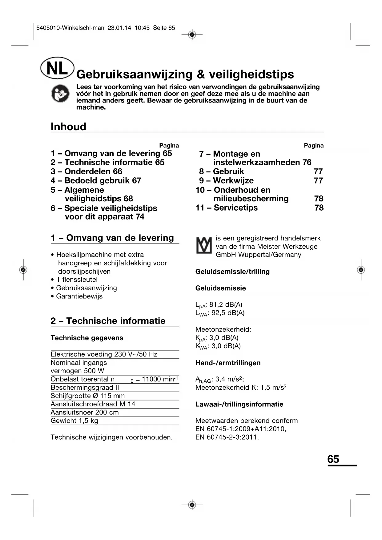 de wet op de productaansprakelijk - heid Niet voor door once apparaten veroorzaakte schade op hoeven te komen, voor zover deze door ondeskundige reparatie veroorzaakt of bij een verrangen van onderdelen Niet once originele onderdelen of door ons goedgekeurde onderdelen gebruikt werden en de reparatie Niet door de klantenservice van Meister Werkzeuge GmbH of een geauthoriseerdevakman uitgevoerd werk! Dit geldt ook voor de gebruekte accessoires.