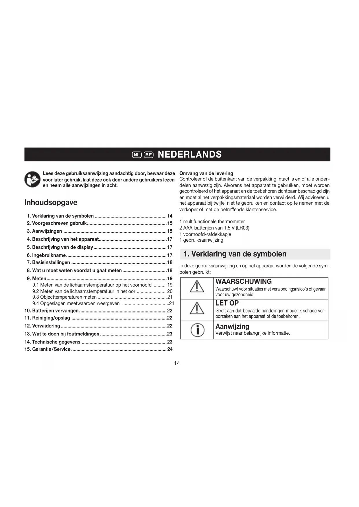 delen aanwezig zijn. Alvorens het apparaat te gebruiken, moet worden gecontroleerd of het apparaat en de toebehoren zichtbaar beschadigd zijn en moet al het verpakkingsmateriaal worden verwijderd. Wij adviseren u het apparaat bij twijfel niet te gebruiken en contact op te nemen met de verkoper of met de betreende klantenservice. 1 multifunctionele thermometer 2 AAA-batterijen van 1,5 V (LR03) 1 voorhoofd-/afdekkapje 1 gebruiksaanwijzing