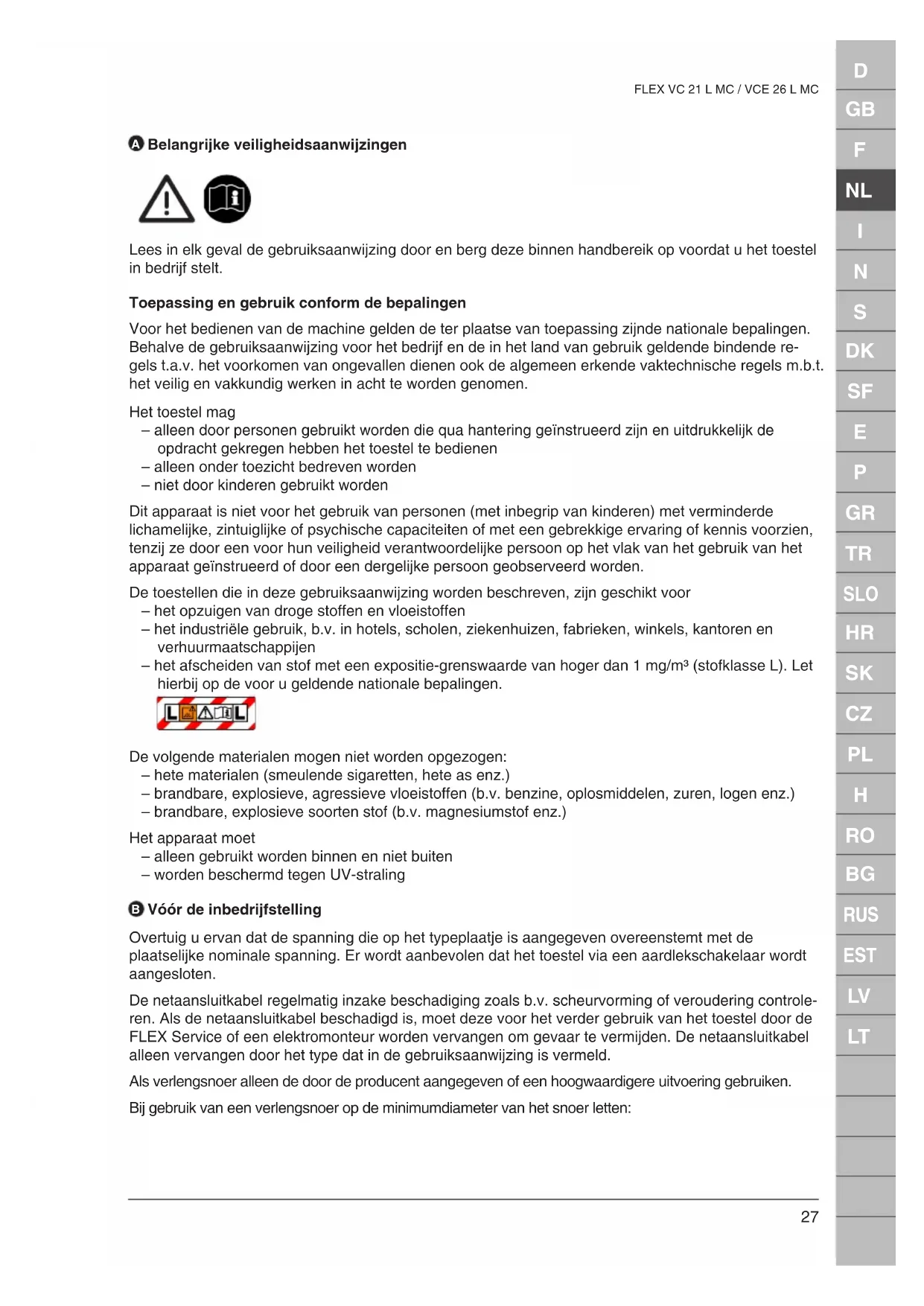 FLEX VC 21 L MC / VCE 26 L MC Vóór het insteken van een toestel in de toestelcontactdoos: